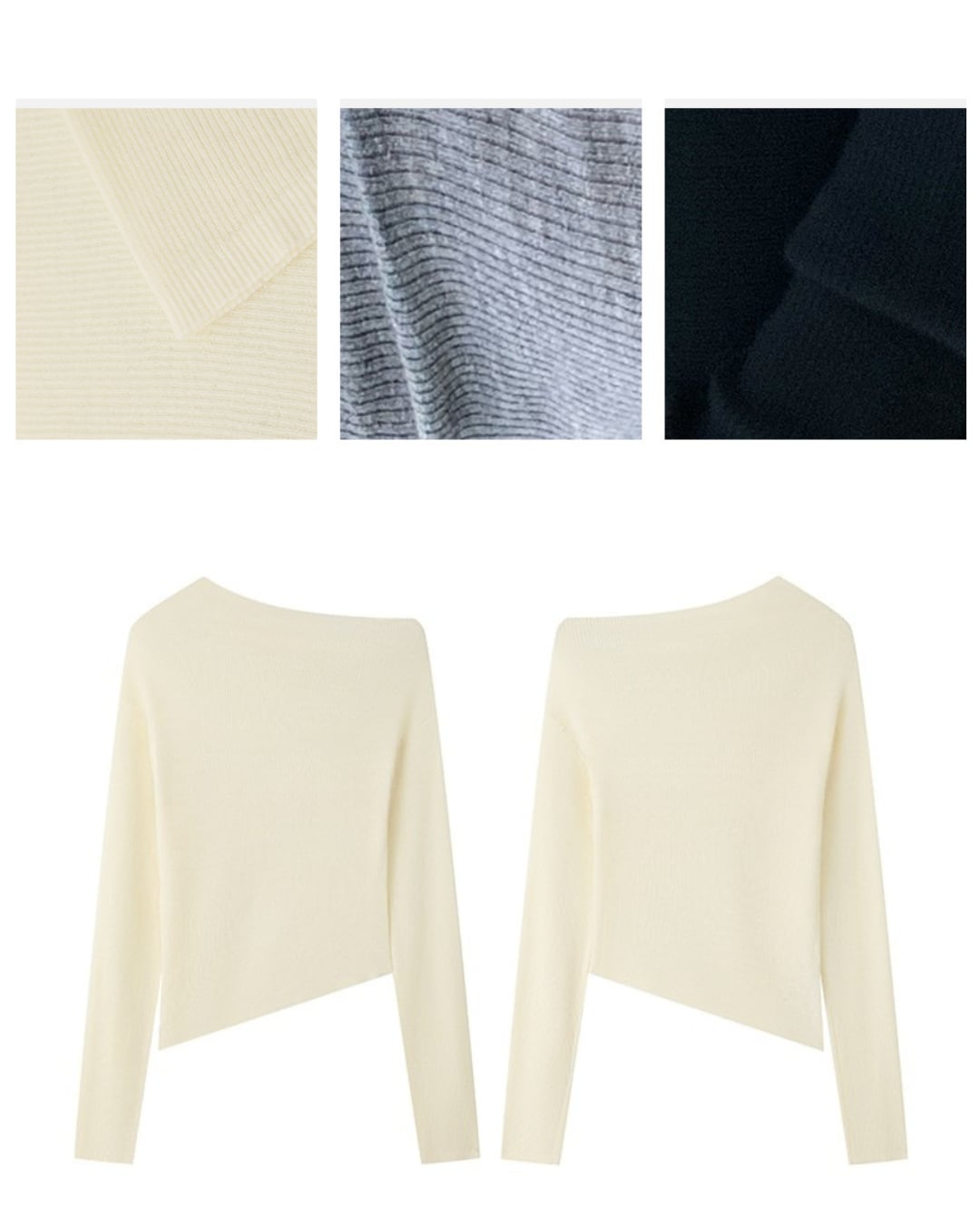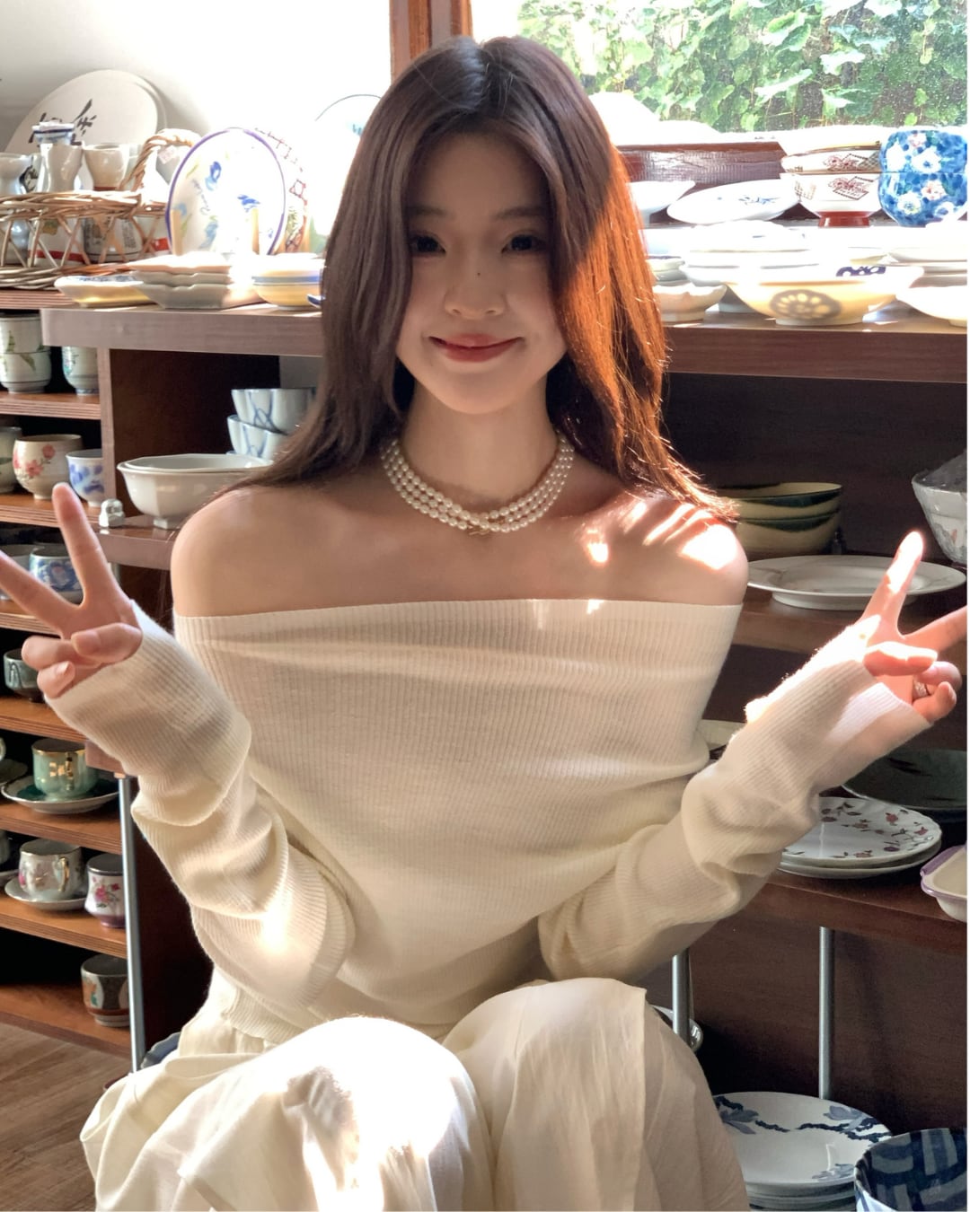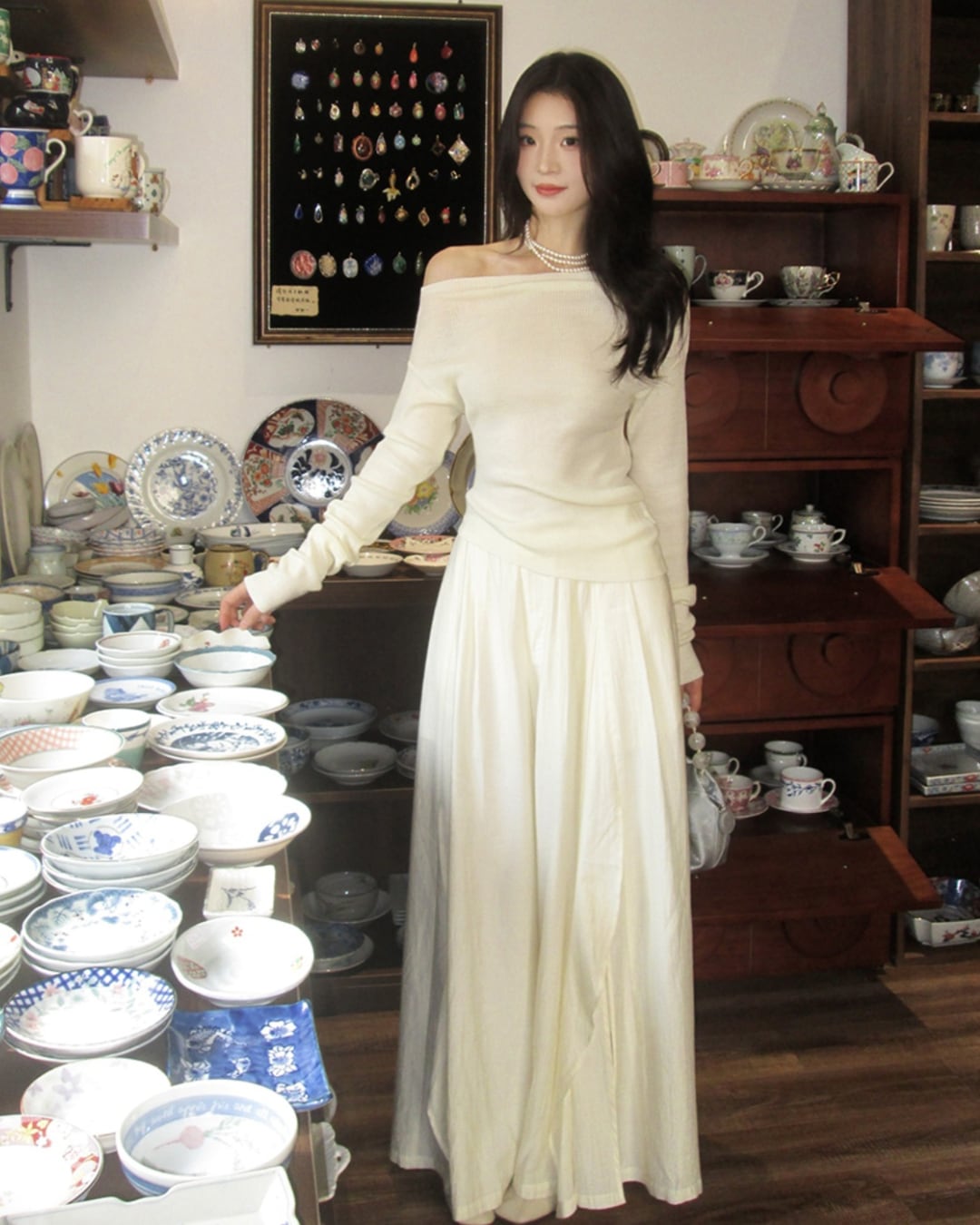 #オフショルニット #リブニット #2WAYトップス #フェミニンコーデ #体型カバー #アシンメトリー裾 #大人ガーリー #クリームホワイト #デコルテ見せ