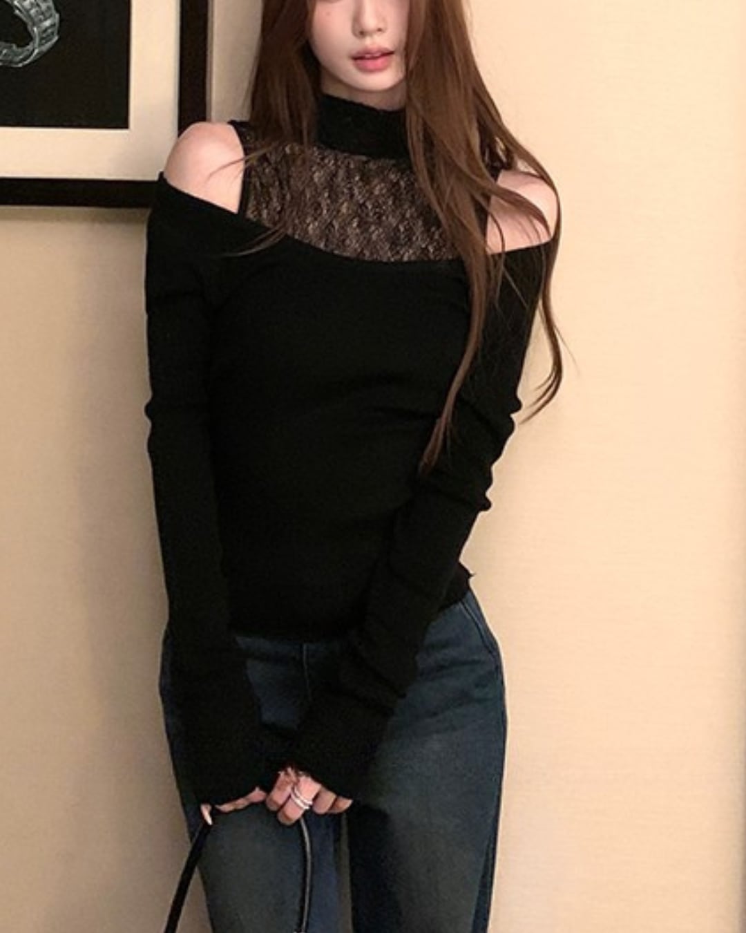 繊細なレースと肩あきデザインが大人フェミニンな雰囲気を演出するトップス。程よいフィット感で上品なシルエットを叶えつつ、柔らかく肌馴染みの良い素材で着心地も抜群。ロングスリーブで秋冬のレイヤードコーデにも活躍するアイテムです。スカートやワイドパンツとの相性も良く、きれいめにもカジュアルにも着こなせます。