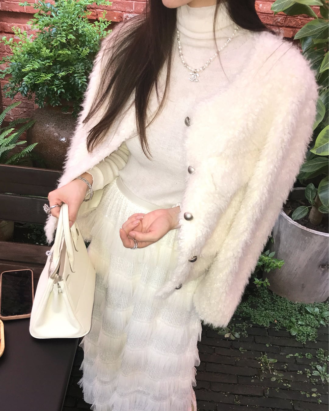 #ふわもこアウター #ショート丈ジャケット #パールボタン #大人ガーリー #ホワイトコーデ #春アウター #華奢見せ #フェミニンスタイル