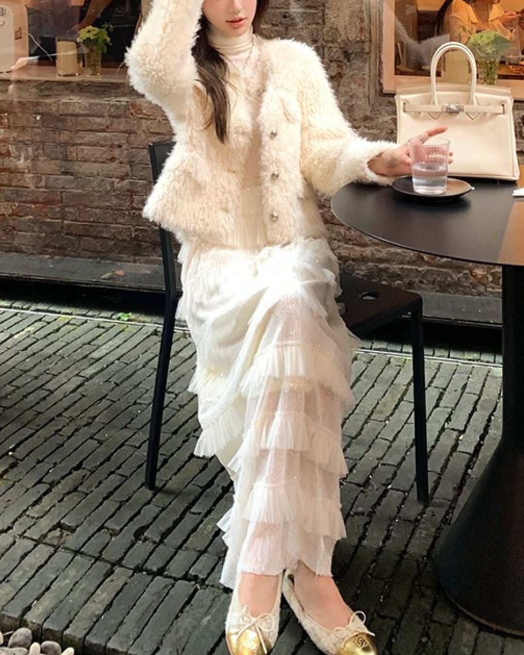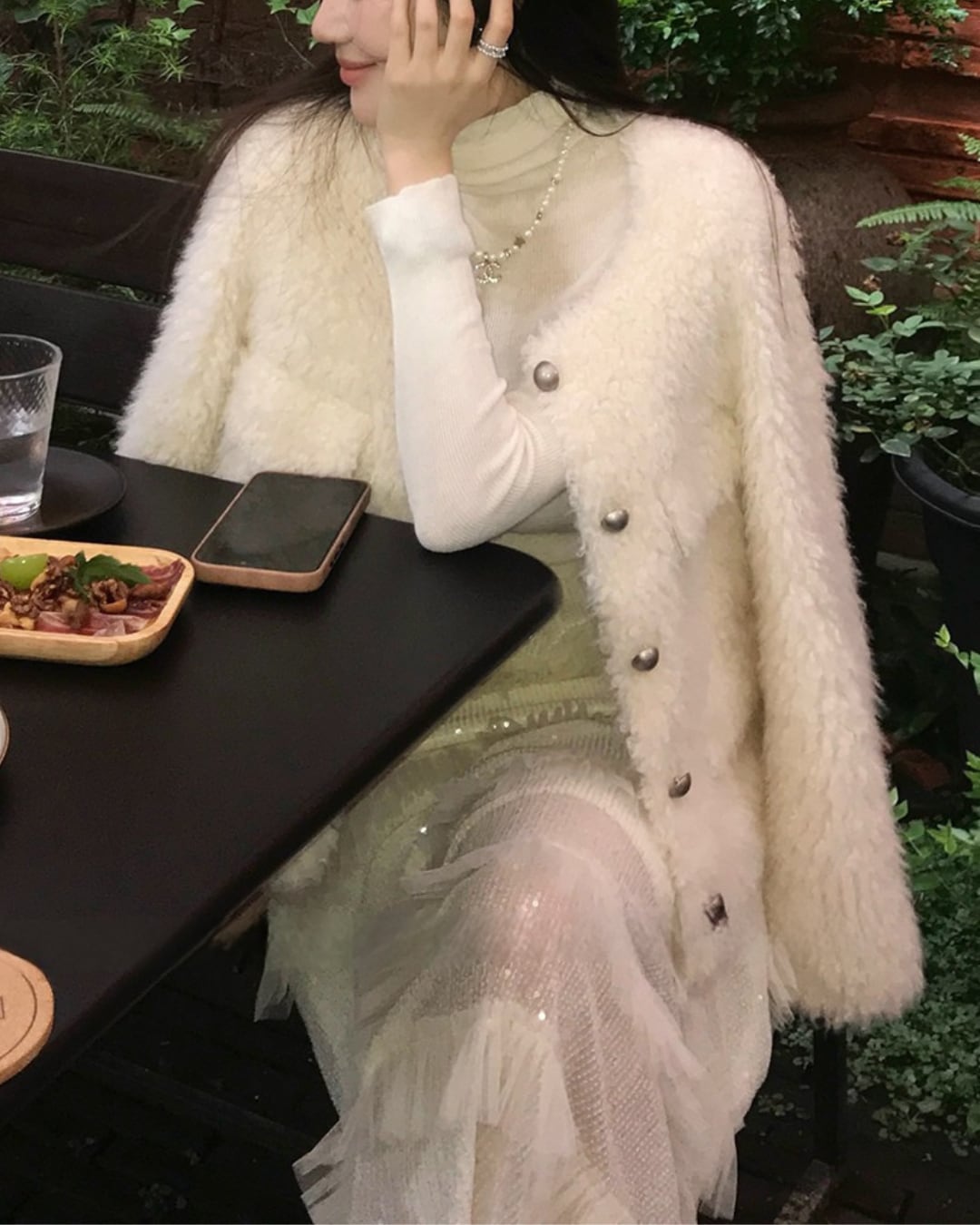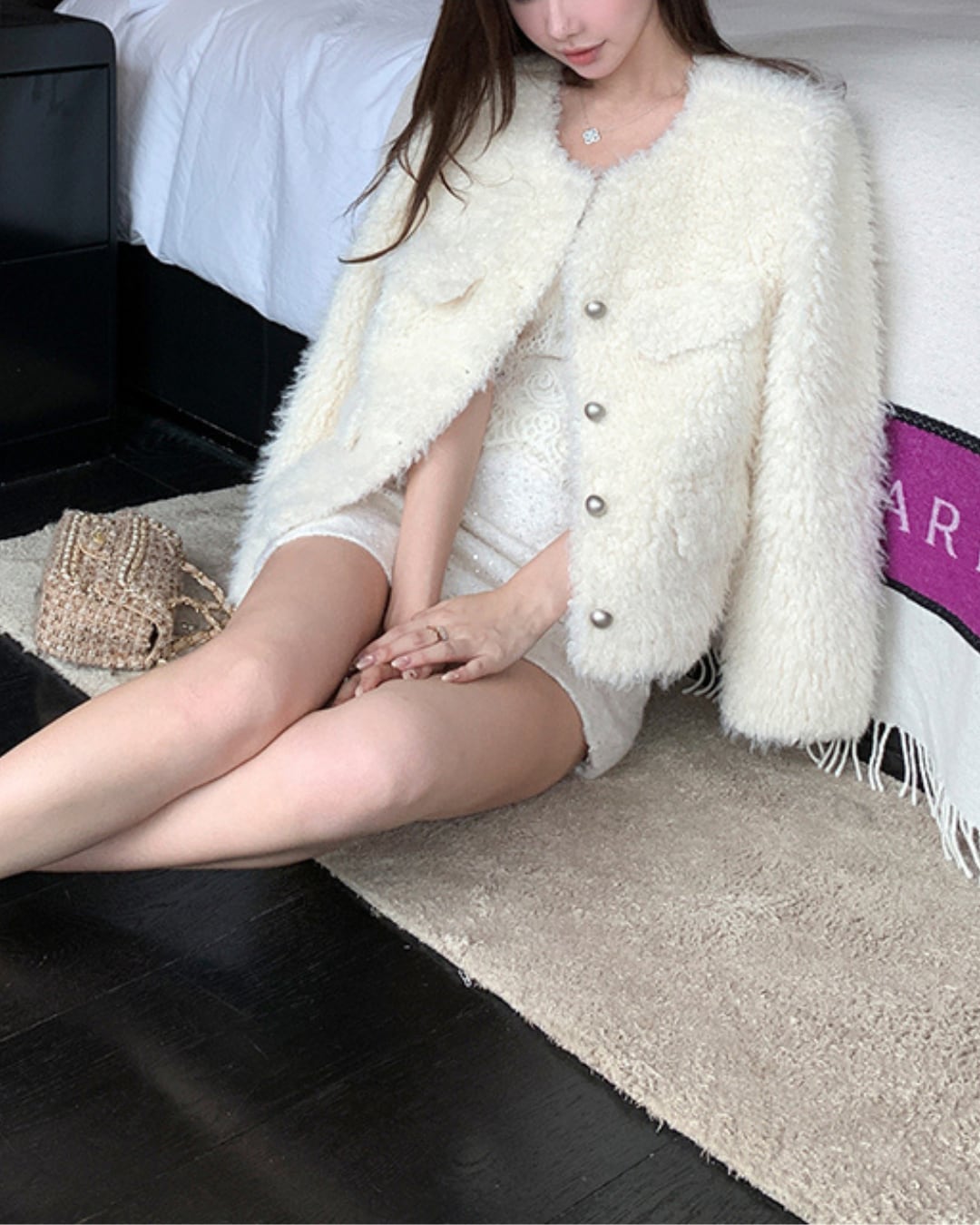 女性らしいやわらかさと上品さを兼ね備えた、ふわもこ素材のショートジャケット。立体感のあるフェイクファーのような質感が高級感を演出し、フロントのパールボタンがアクセントに。インナーにはタートルネックやワンピースを合わせて、春先まで着られる万能アウター。コンパクトな丈感でスタイルアップ効果もあり、大人ガーリースタイルにぴったりの一着です。