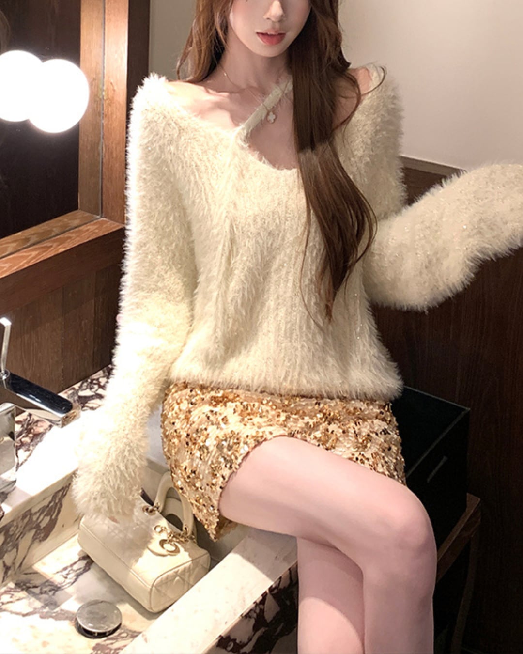 ふわふわシャギー素材×繊細ラメで華やかに仕上げたVネックニット。ボリューム感のある毛足がリュクスな印象を与えつつ、デコルテを美しく見せるVネックで抜け感も演出。ゴールドやシルバーのミニスカートと合わせれば、一気におしゃれ上級者コーデに。デートや女子会、特別な日のコーディネートにぴったりの存在感ある一着です。カラー違いで揃えたくなる、大人ガーリーのマストバイアイテム。