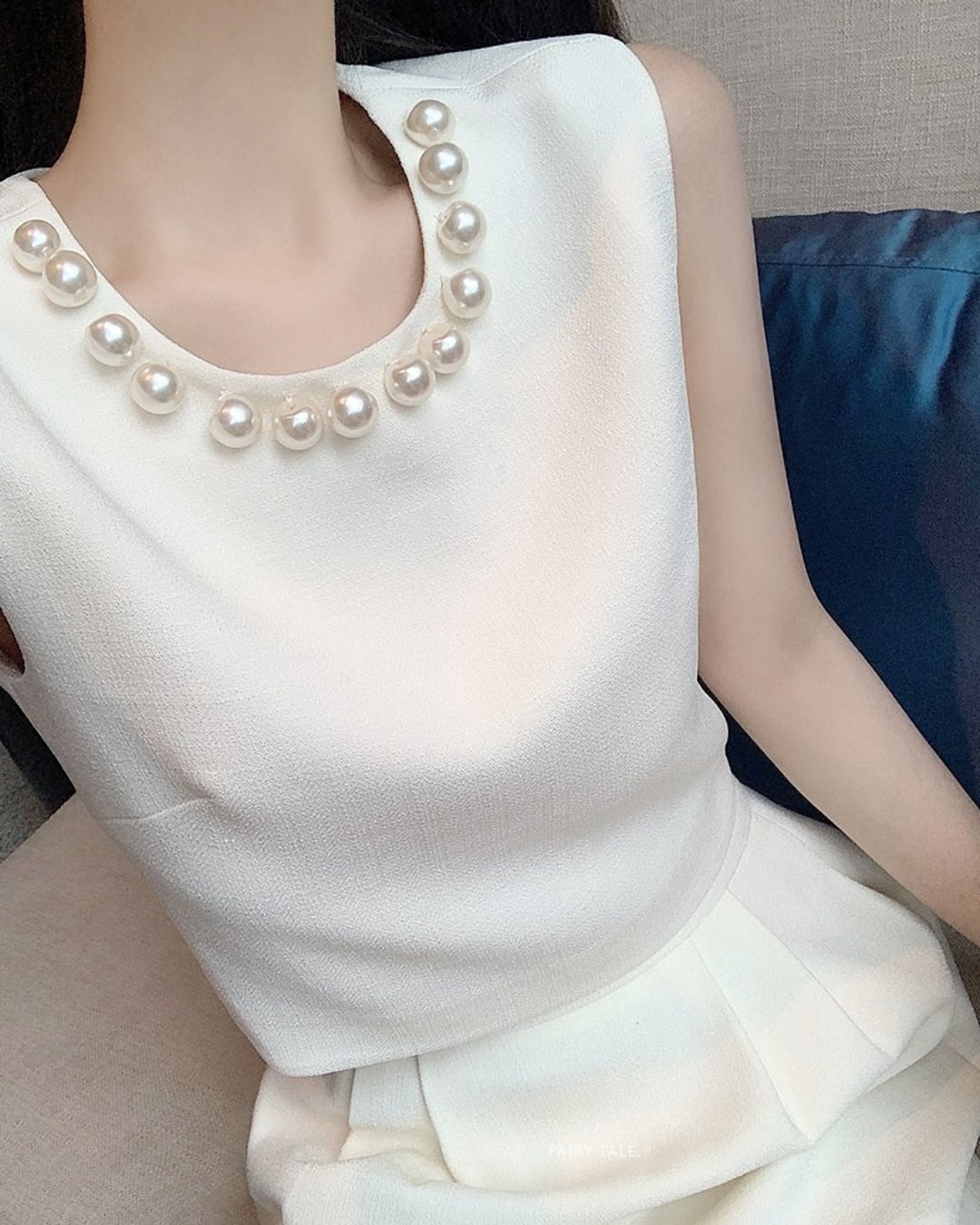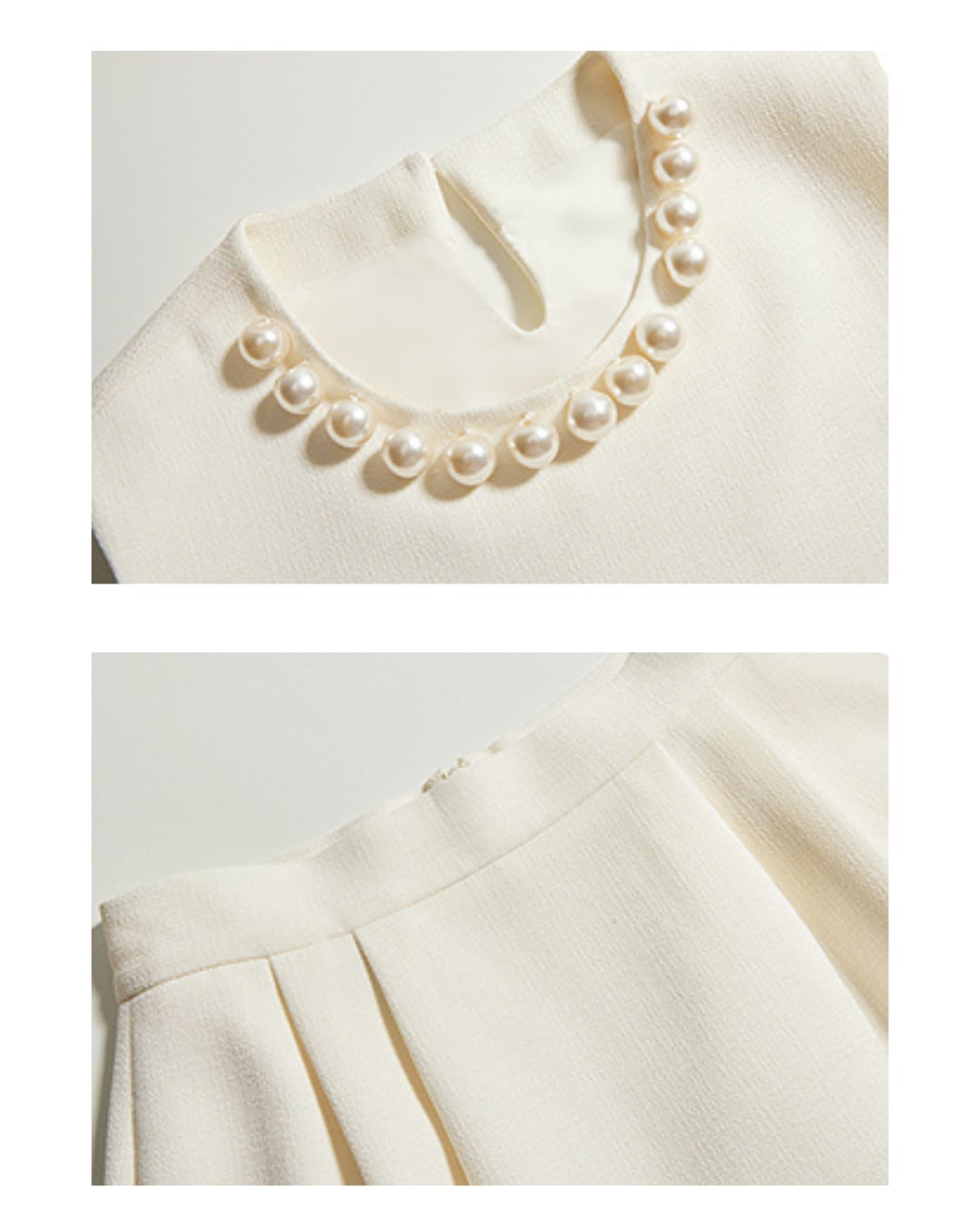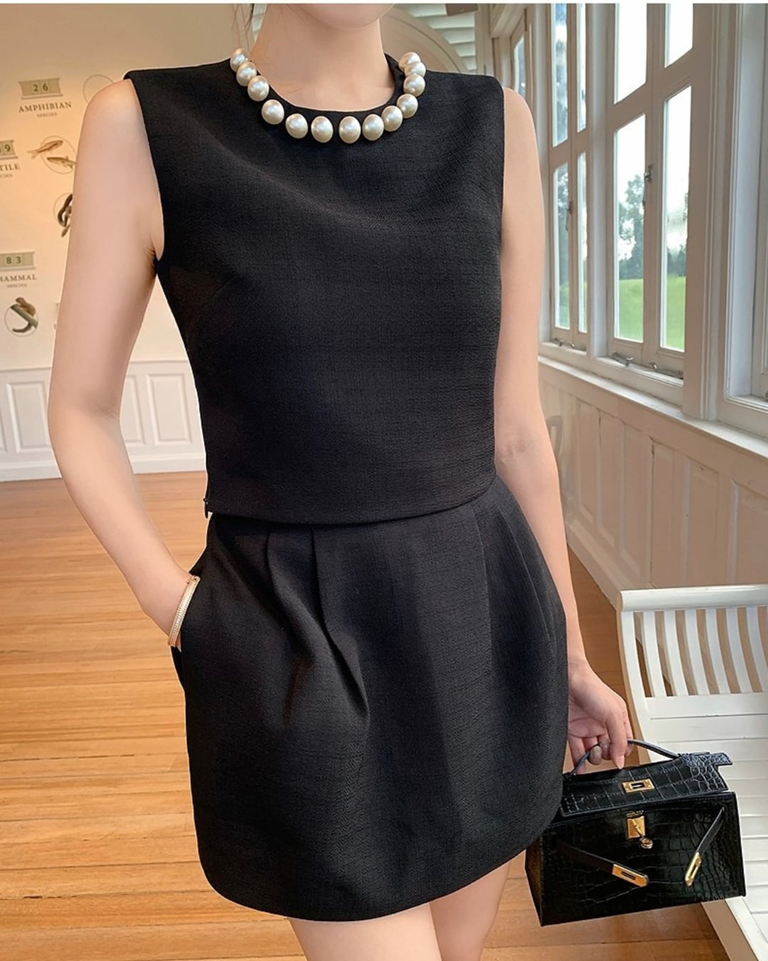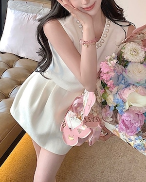 首元にあしらわれた大粒パールが目を惹く、上品クラシカルなノースリーブトップスと、立体タックで美シルエットを叶えるハイウエストミニスカートのセットアップ。程よいハリ感とマットな光沢を持つ仿醋酸風素材が高見えし、フォーマルにもデイリーにも使える万能アイテムです。それぞれ単品使いもできるので、着回し力も抜群◎アクセや小物で雰囲気を変えて、デートやお呼ばれ、ホテルディナーにもぴったりの一着です。