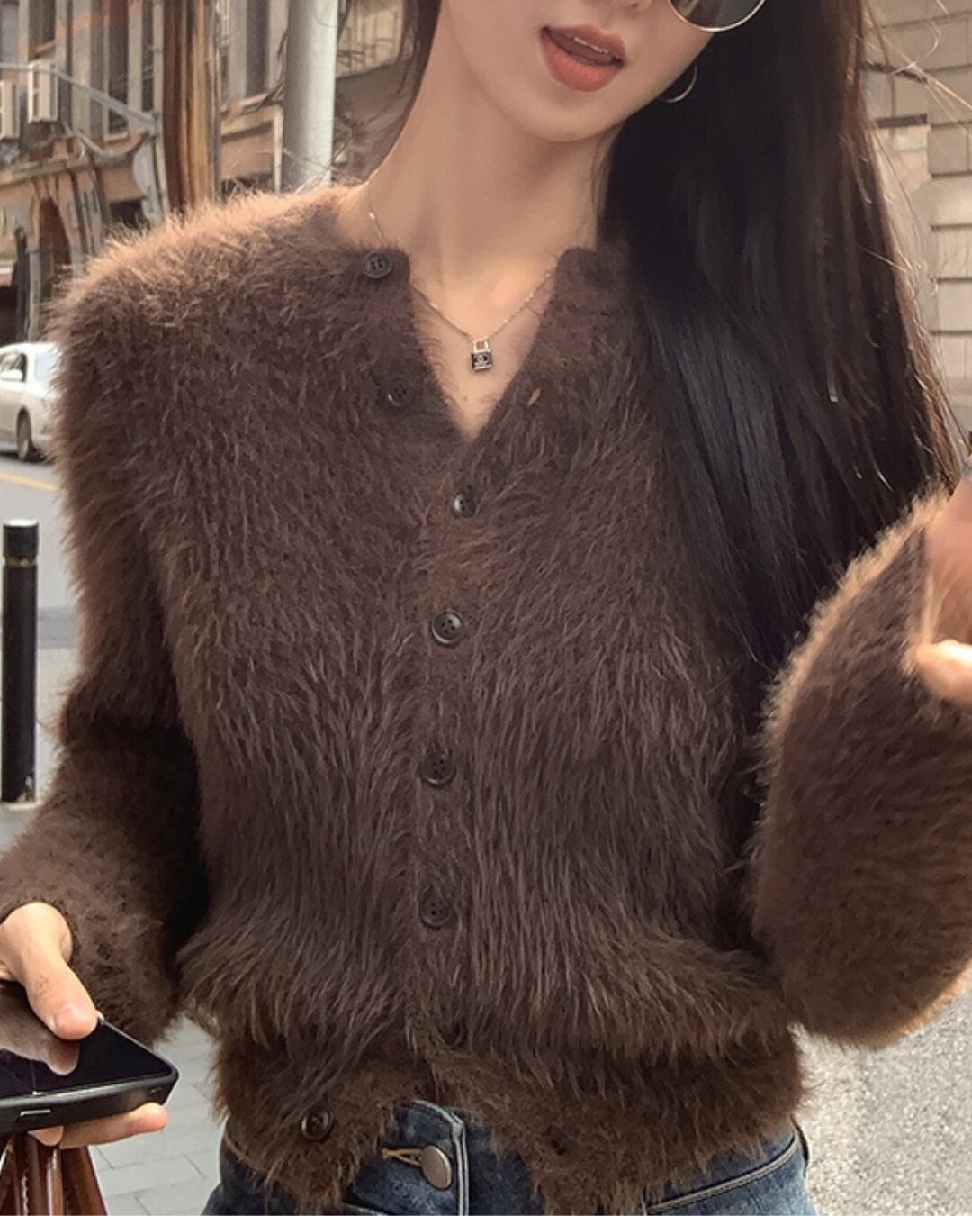 顔まわりをすっきり見せるラウンドネックデザインに、同色のフロントボタンをあしらったフェイクファー風カーディガン。まるで水貂のようなふわふわな毛足と、しっとり柔らかな肌触りが魅力。軽やかで暖かく、秋冬のレイヤードスタイルにぴったりなアイテム。カジュアルからきれいめまで幅広く着回せる万能カーデです。