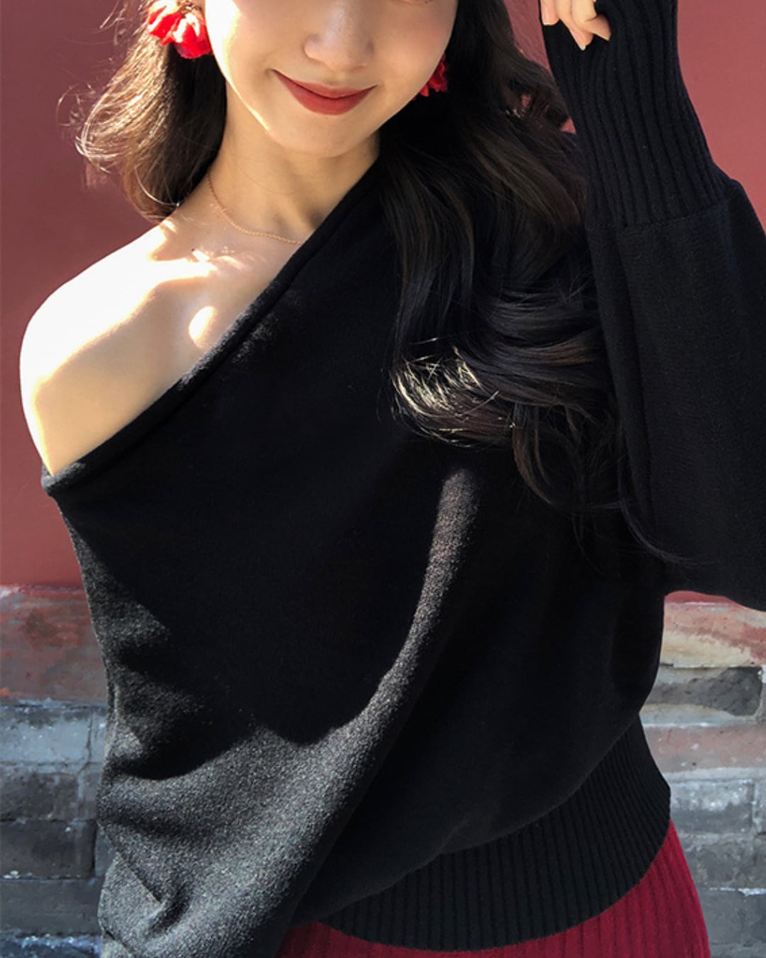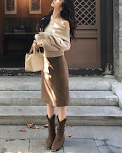 #オフショルダー #ワンショルニット #大人ガーリー #ウール混 #秋冬トップス #抜け感コーデ #フェミニンカジュアル