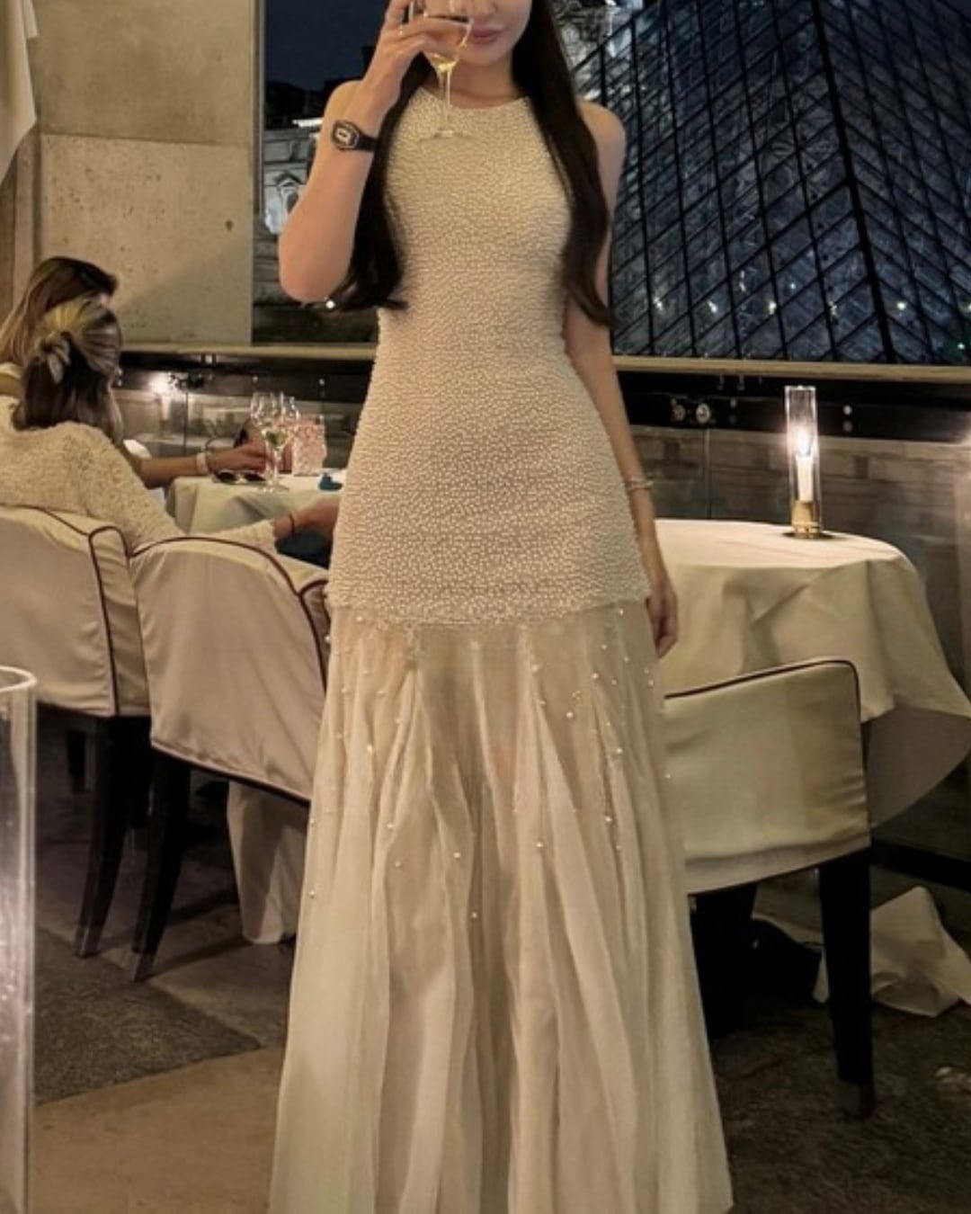 美しい刺繍と柔らかなチュール素材が魅力の一着。精緻な刺繍とパールの装飾が上品な輝きを放ち、特別な日のためにデザインされたドレスです。結婚式やパーティーなど、華やかなシーンにぴったり。優雅でエレガントなシルエットが、着る人をさらに美しく引き立てます。