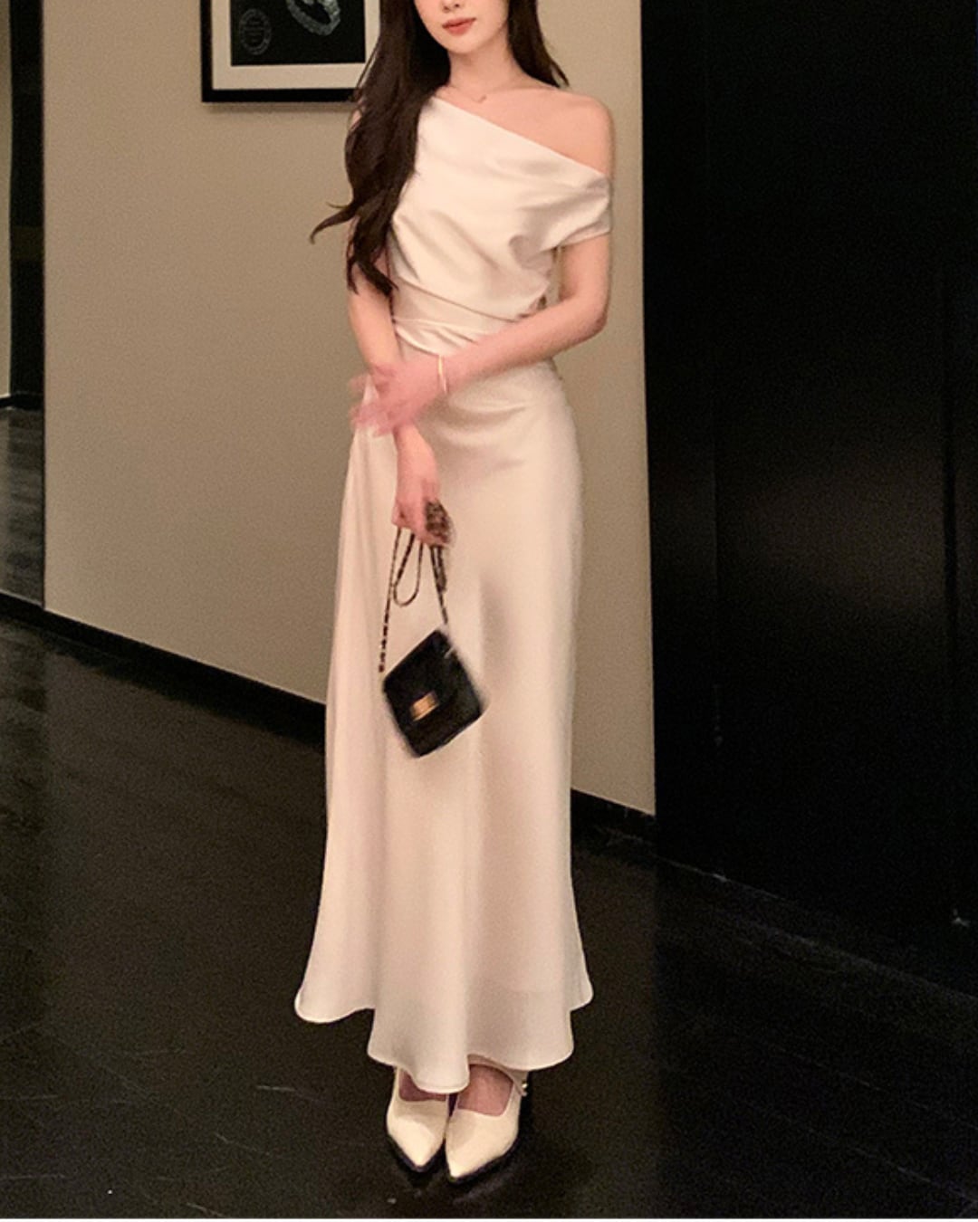 上品で洗練されたデザインが特徴のオフショルダーサテンロングドレス。滑らかなサテン素材が光を受けて美しい輝きを放ち、シンプルながらも華やかさを感じさせます。オフショルダーデザインが女性らしい肩のラインを引き立て、エレガントな印象に。フロアレングスで、歩くたびにドレープが美しく揺れる、まさに特別な日にぴったりのドレスです。華やかな場面やディナー、結婚式などに最適で、アクセサリーやヒールとの相性も抜群。