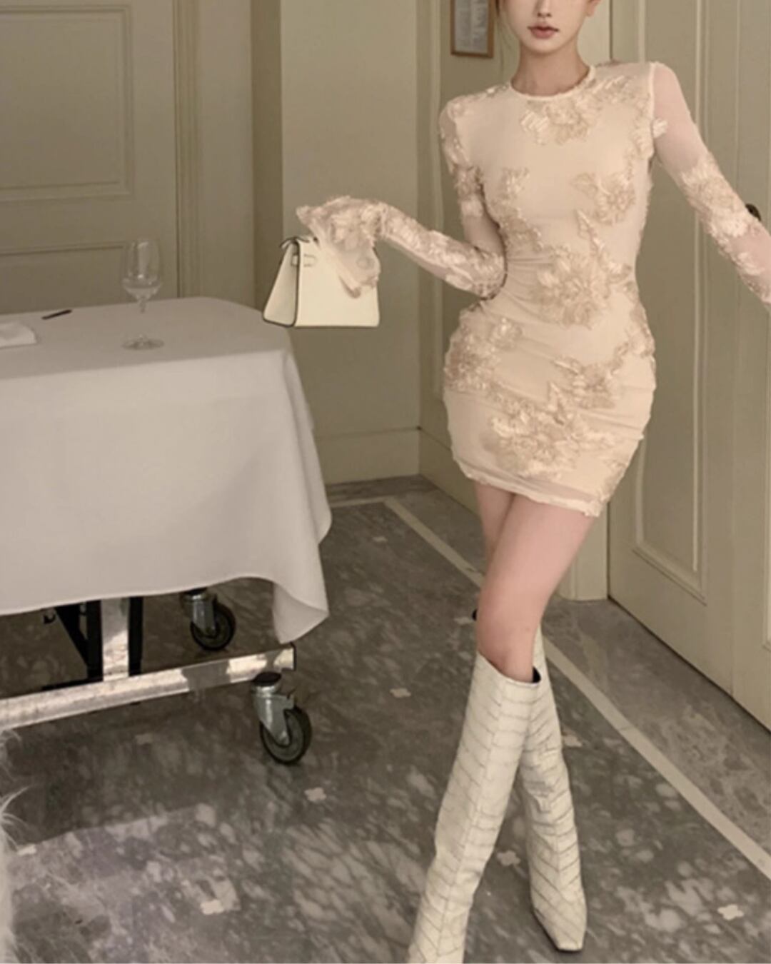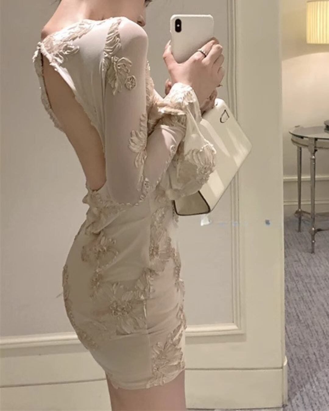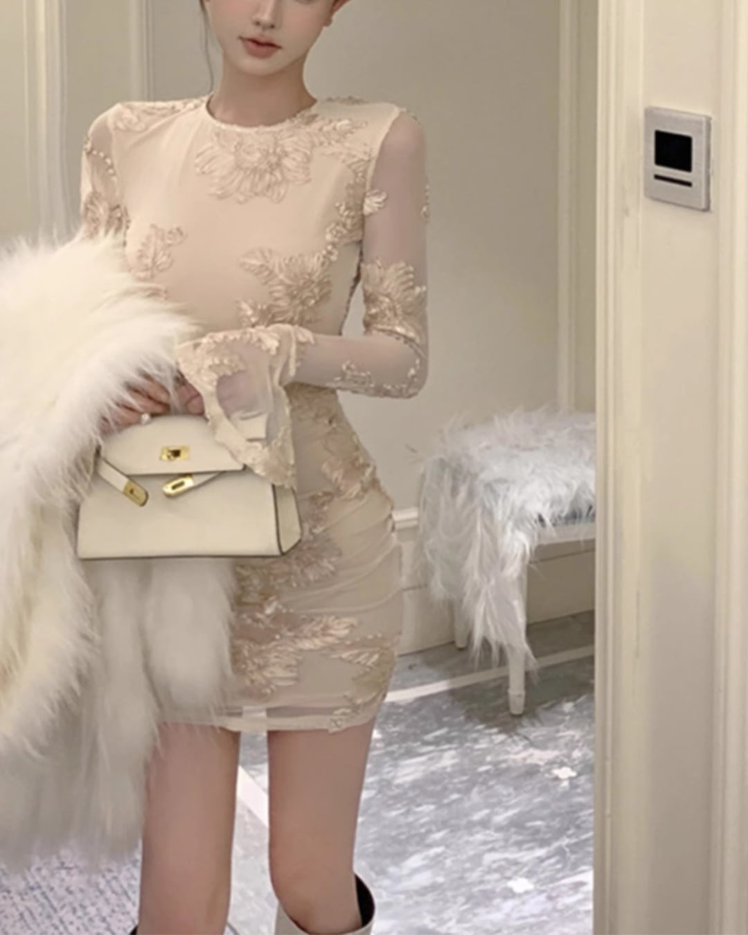 #レースワンピース #シアースリーブ #立体刺繍 #バックオープン #パーティーワンピ #大人ガーリー #美シルエット