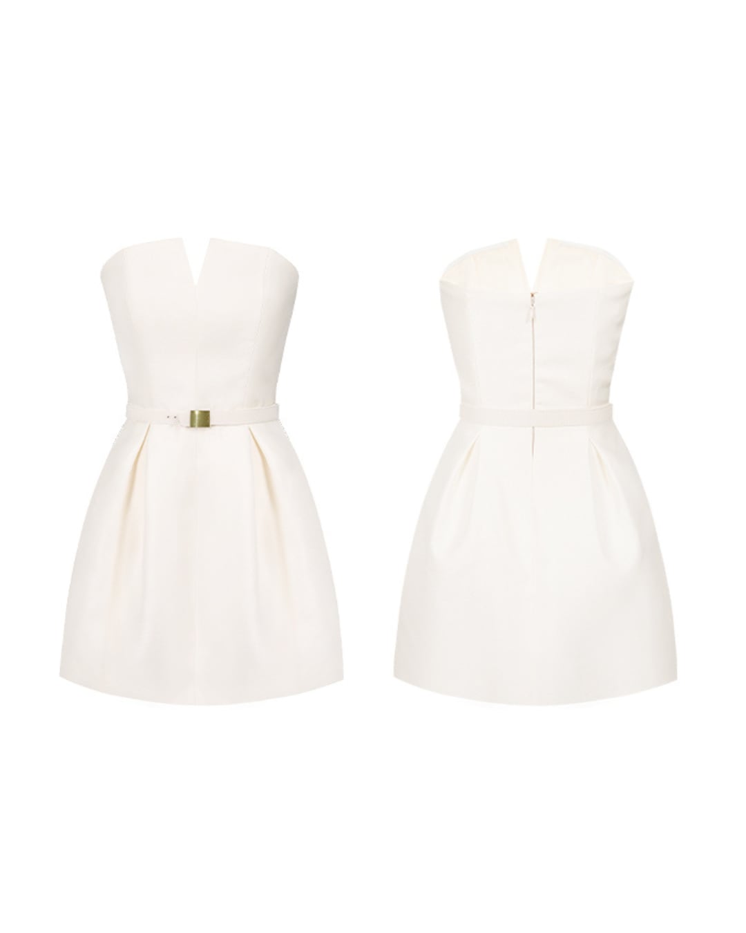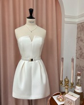 胸元のカットデザインが印象的なビスチェ風ミニワンピース。ウエストには華奢なベルトが付属しており、スタイルアップ効果も抜群。程よくハリ感のある素材と立体感のあるタック入りスカートが、きれいなAラインシルエットをつくります。上品なアイボリーカラーで、大人ガーリーにもきれいめにも着こなせる万能な一枚です。デートやお呼ばれ、パーティーにもおすすめ◎