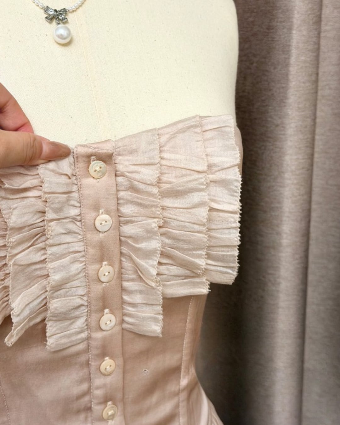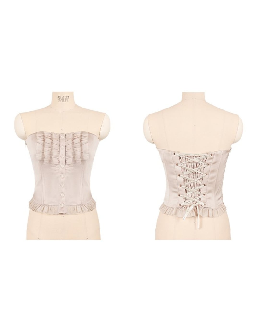 フロントにあしらわれた繊細なフリルとボタンディテールがクラシカルな印象を与えるコルセット風ビスチェ。バックスタイルはレースアップ仕様になっており、サイズ感の調整が可能で美しいシルエットを演出します。裾のフリルもポイントになっており、スカートにもパンツにも合わせやすいデザイン。1枚で主役級の存在感を放つ、大人ガーリーなスタイルにぴったりのアイテムです。