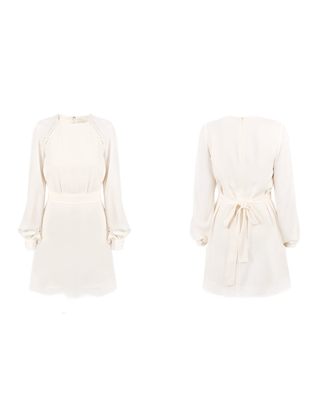 クラシカルな雰囲気が魅力の長袖ミニワンピース。柔らかなアイボリートーンで、フェミニンさと上品さを兼ね備えた一着です。胸元のさりげないディテールと、ウエストリボンで自然にスタイルアップ。軽やかな素材感で秋冬はもちろん、春にもおすすめ。オンオフ問わず活躍してくれる、大人ガーリースタイルにぴったりのアイテムです。