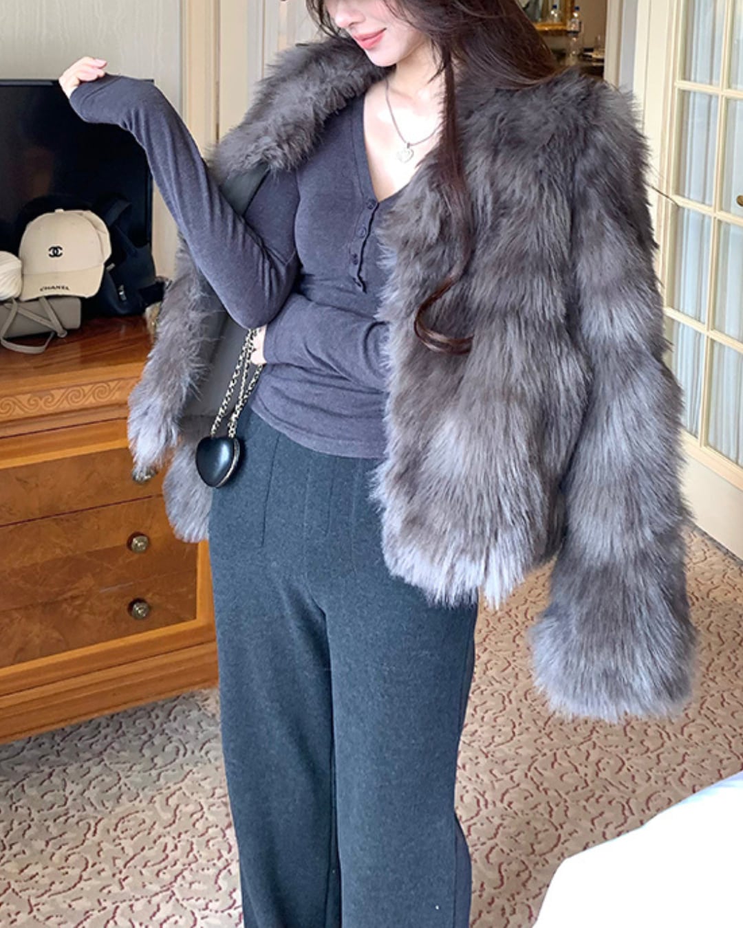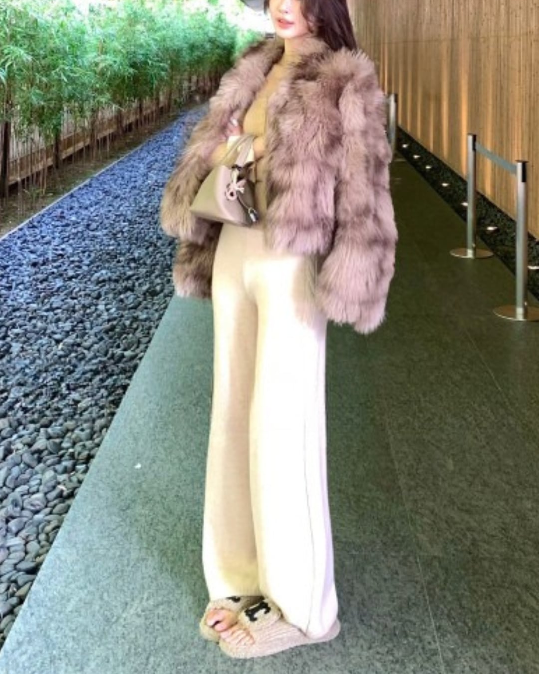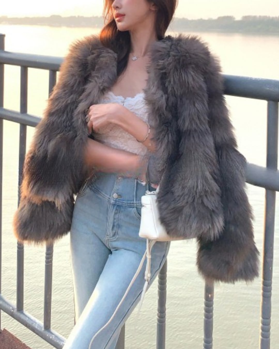 贅沢なボリューム感が魅力のフェイクフォックスファージャケット。毛足の長い上質なフェイクファーは、本物のような高級感とふんわりとした柔らかさが特徴です。二色の毛並みが絶妙にミックスされており、見る角度によって表情が変わるのもポイント。デニムやスウェットに合わせてカジュアルダウンするのも、大人ガーリーにまとめるのもおすすめの1枚です。