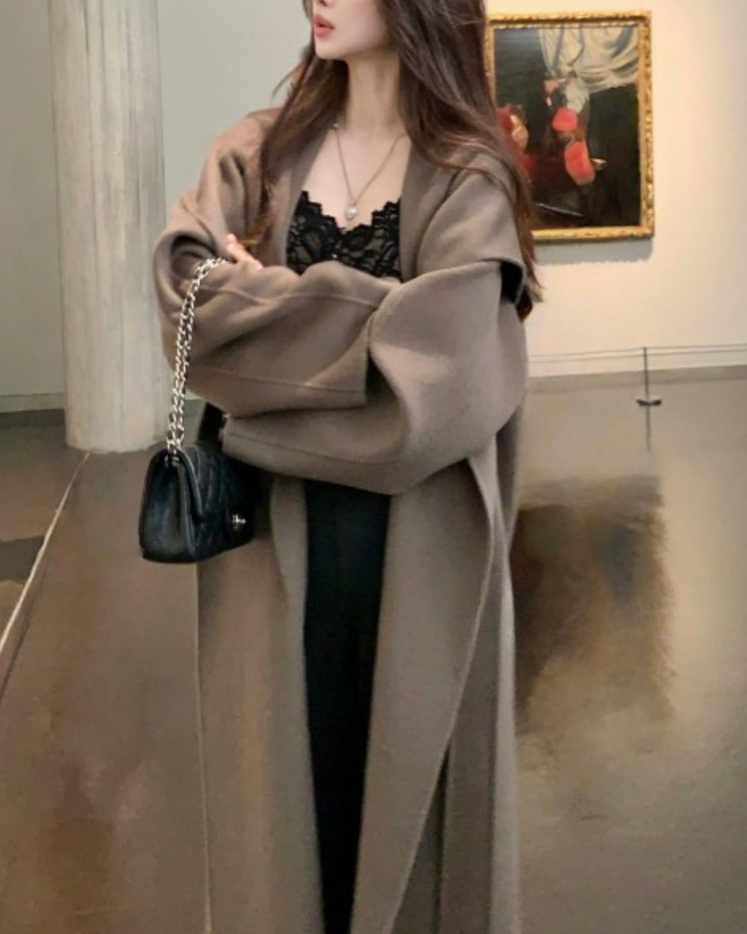大きめのショールカラーが印象的な、リュクス感漂うロング丈ローブコート。高品質なオーストラリア産ウールを100%使用しており、しっかりとした厚みと柔らかい肌触りが魅力です。共布ベルト付きでウエストをぎゅっと絞れば、上品で女性らしいシルエットに。肩の力を抜いたリラックス感と、洗練された大人の雰囲気を両立した一枚は、秋冬の主役アウターとして重宝すること間違いなしです。
