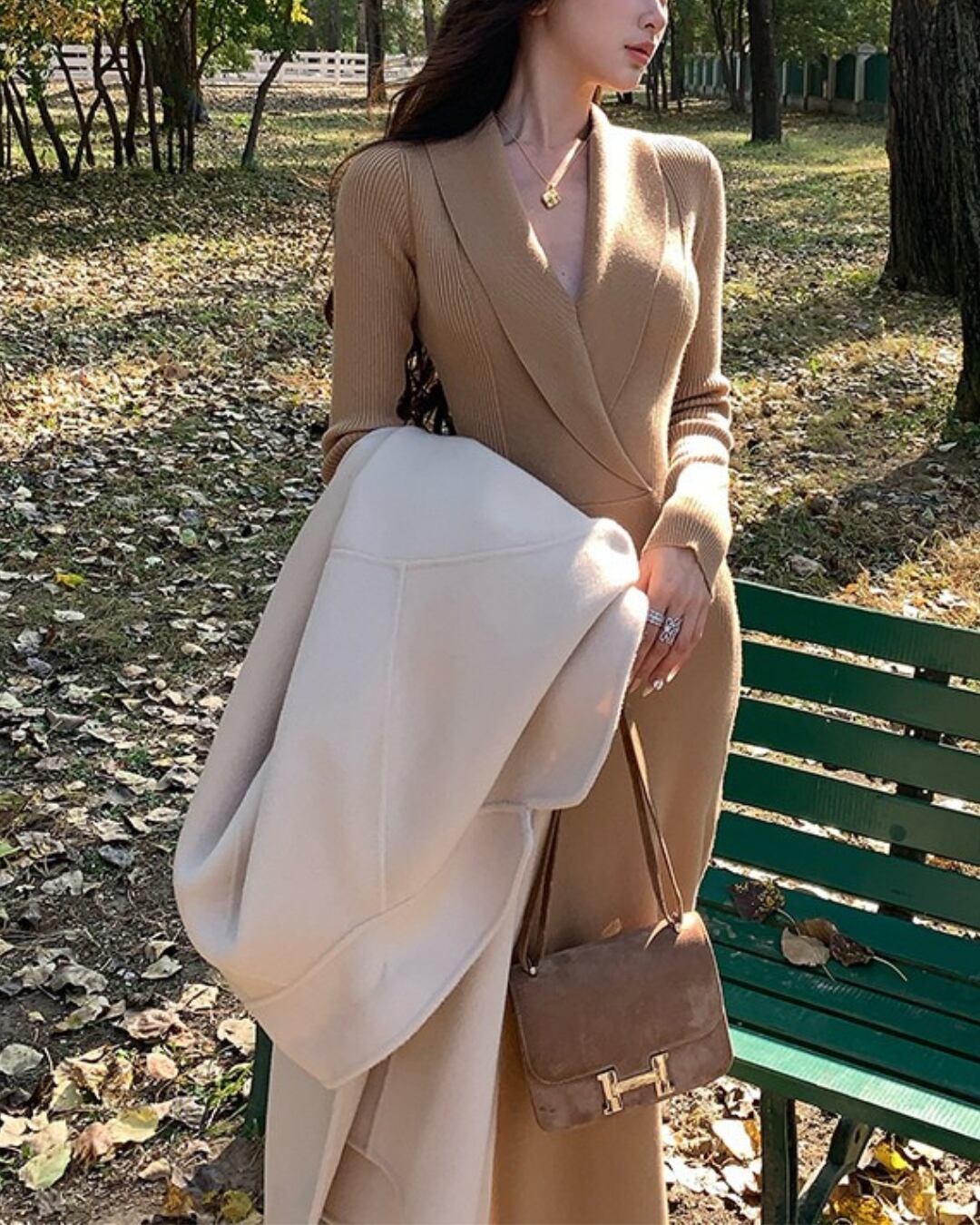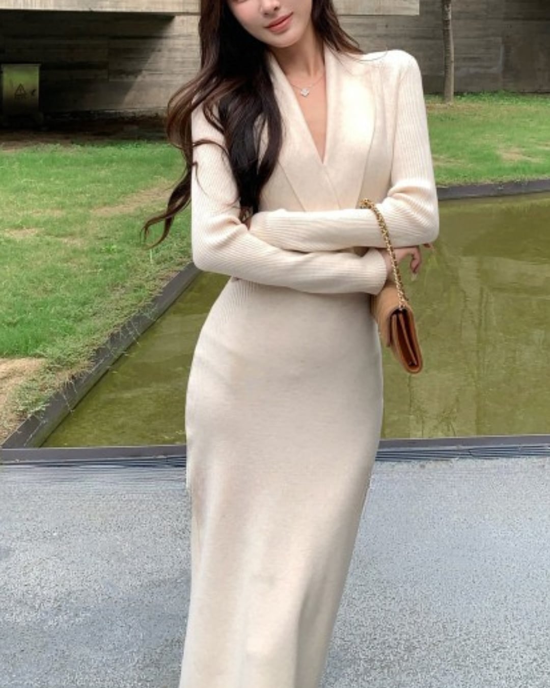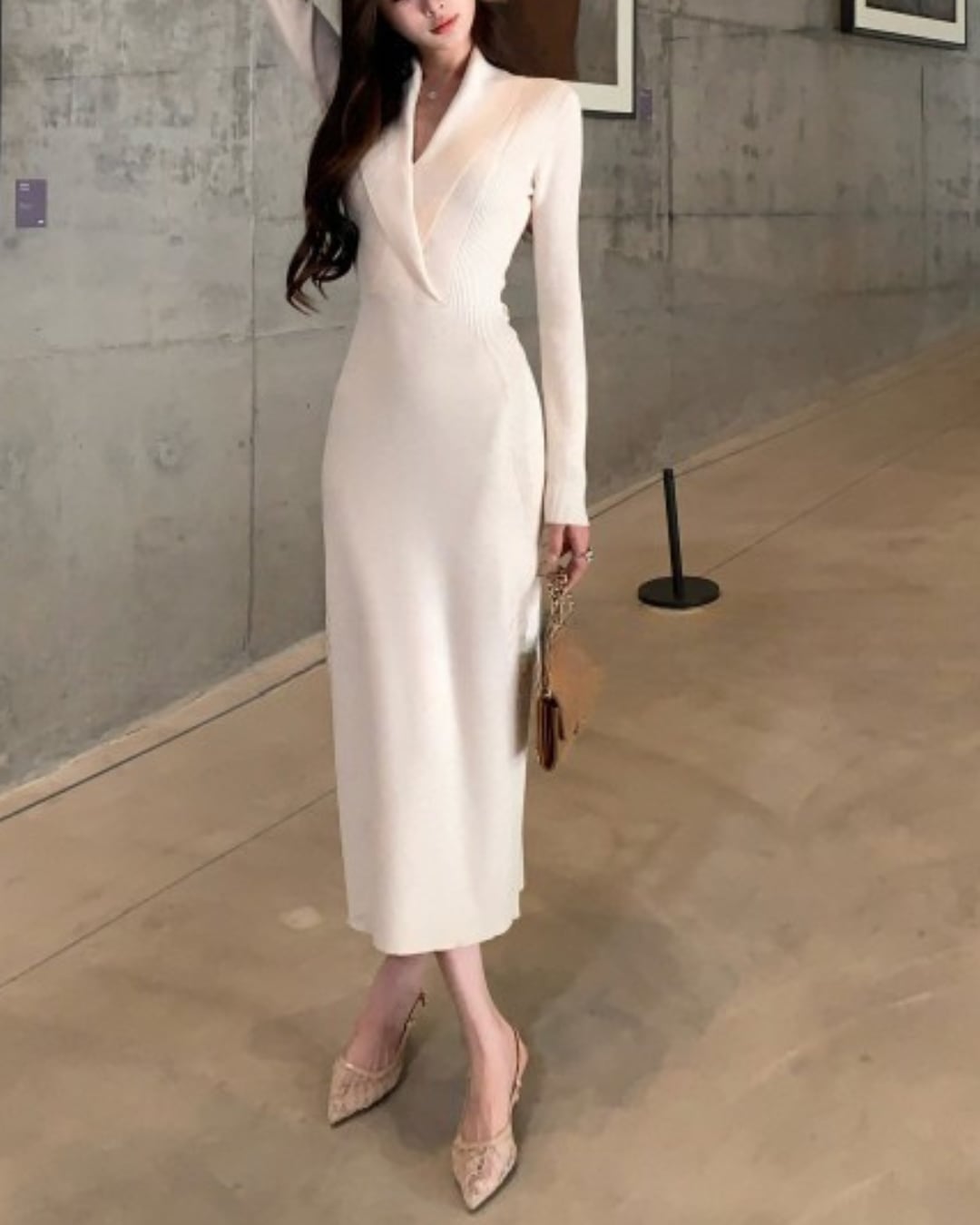 #Vネックワンピース #リブニット #ウエストマーク #ミモレ丈 #大人ガーリー #細見えシルエット #秋冬コーデ