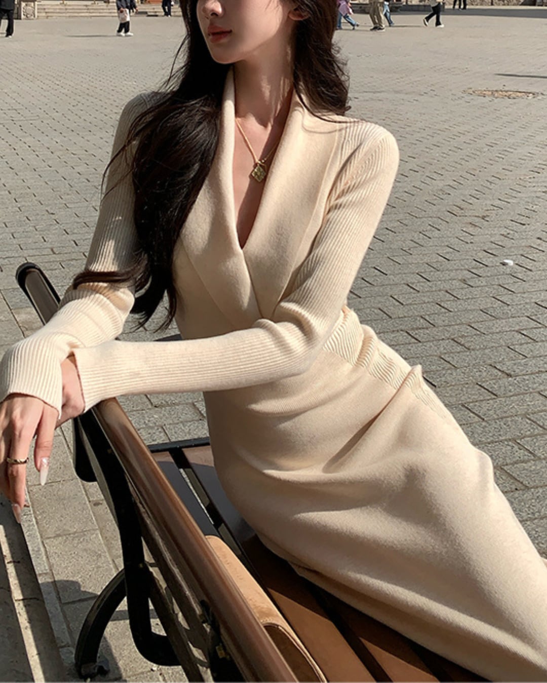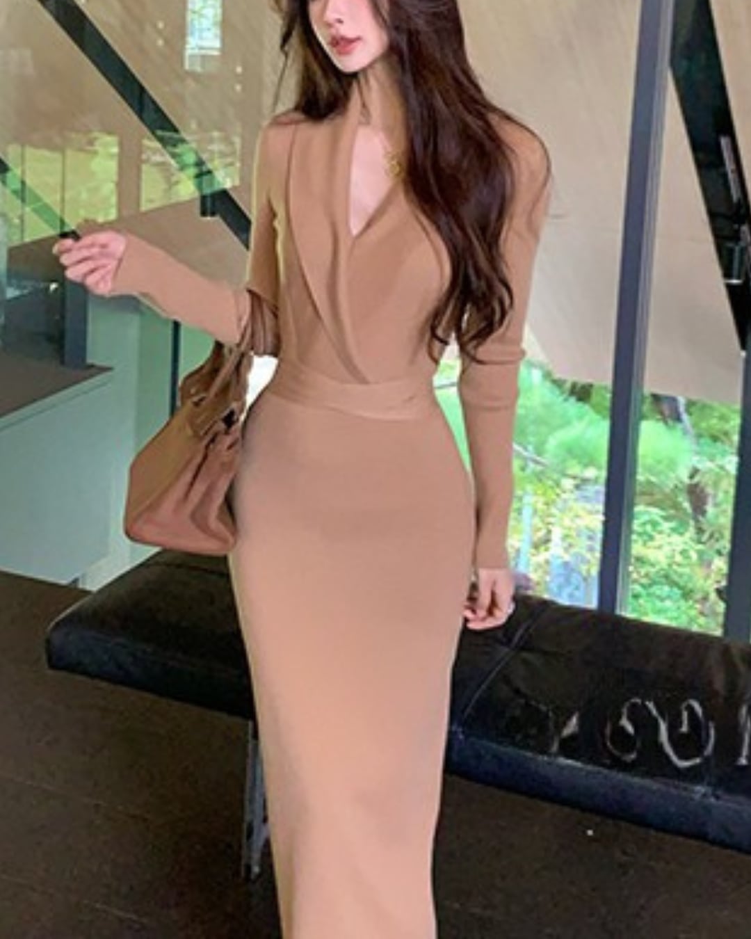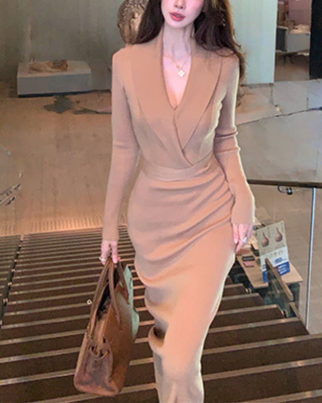 #Vネックワンピース #リブニット #ウエストマーク #ミモレ丈 #大人ガーリー #細見えシルエット #秋冬コーデ
