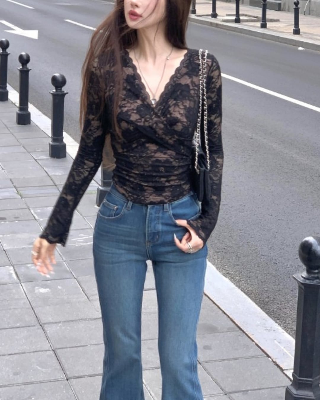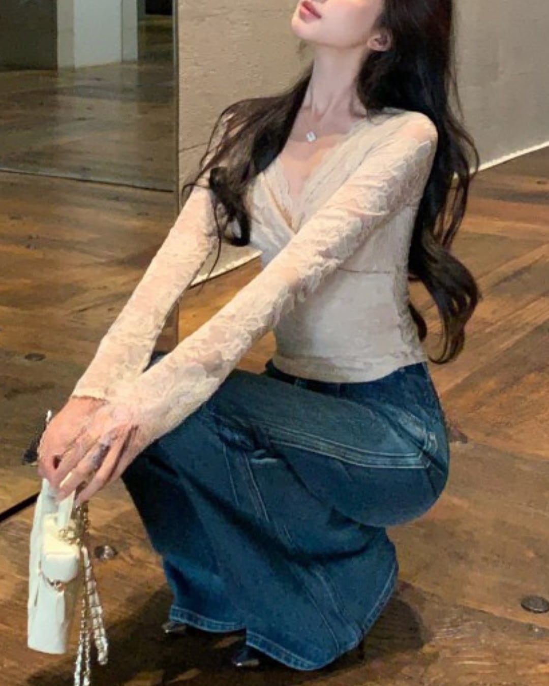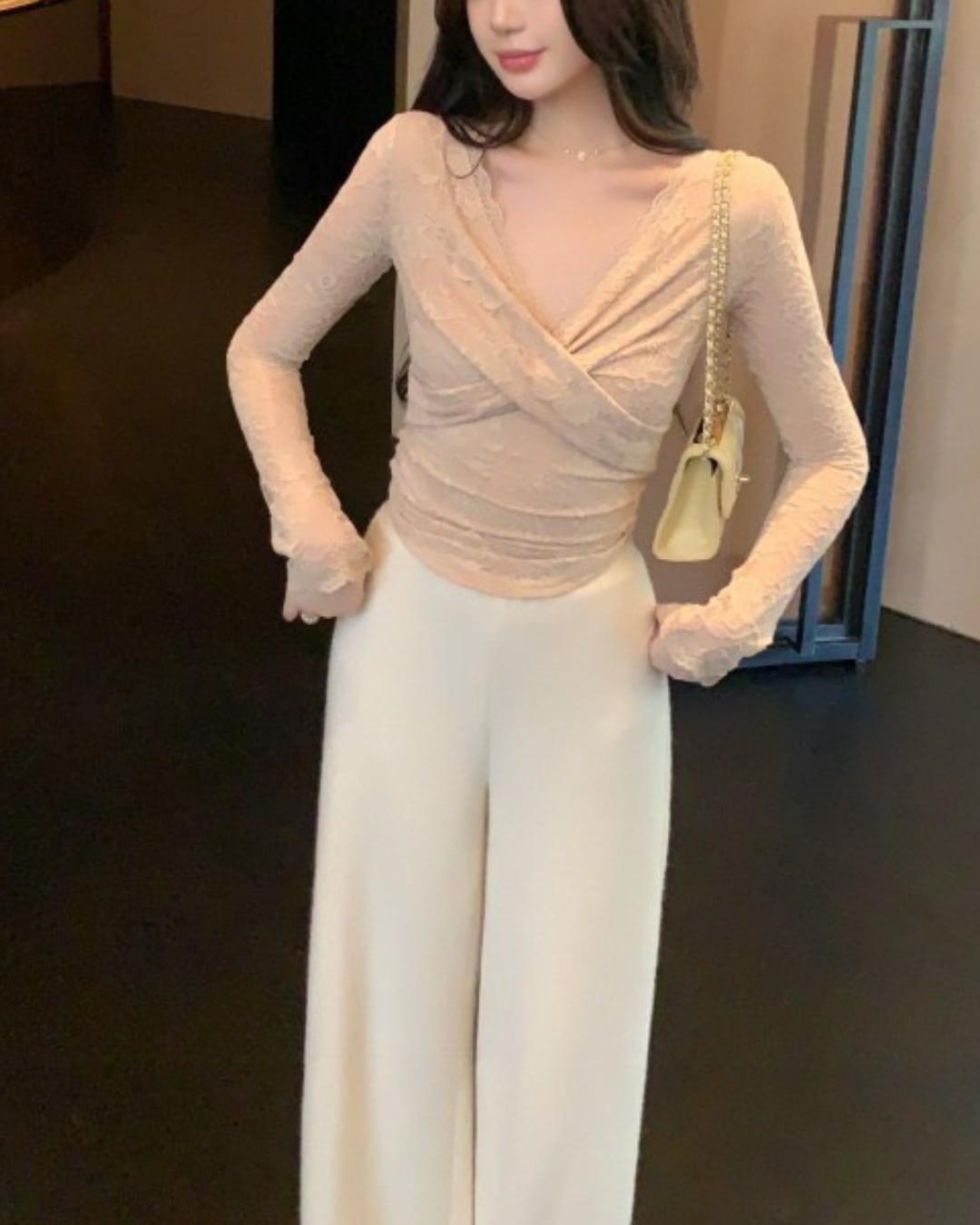 繊細なレース素材とボディラインを美しく見せるクロスVネックデザインが特徴のトップス。程よい透け感が大人ガーリーな雰囲気を演出し、デニムやスラックス、スカートにも合わせやすく、デイリーからデートスタイルまで幅広く活躍します。カラーによって印象が変わるので、色違いで持っておきたいアイテムです。