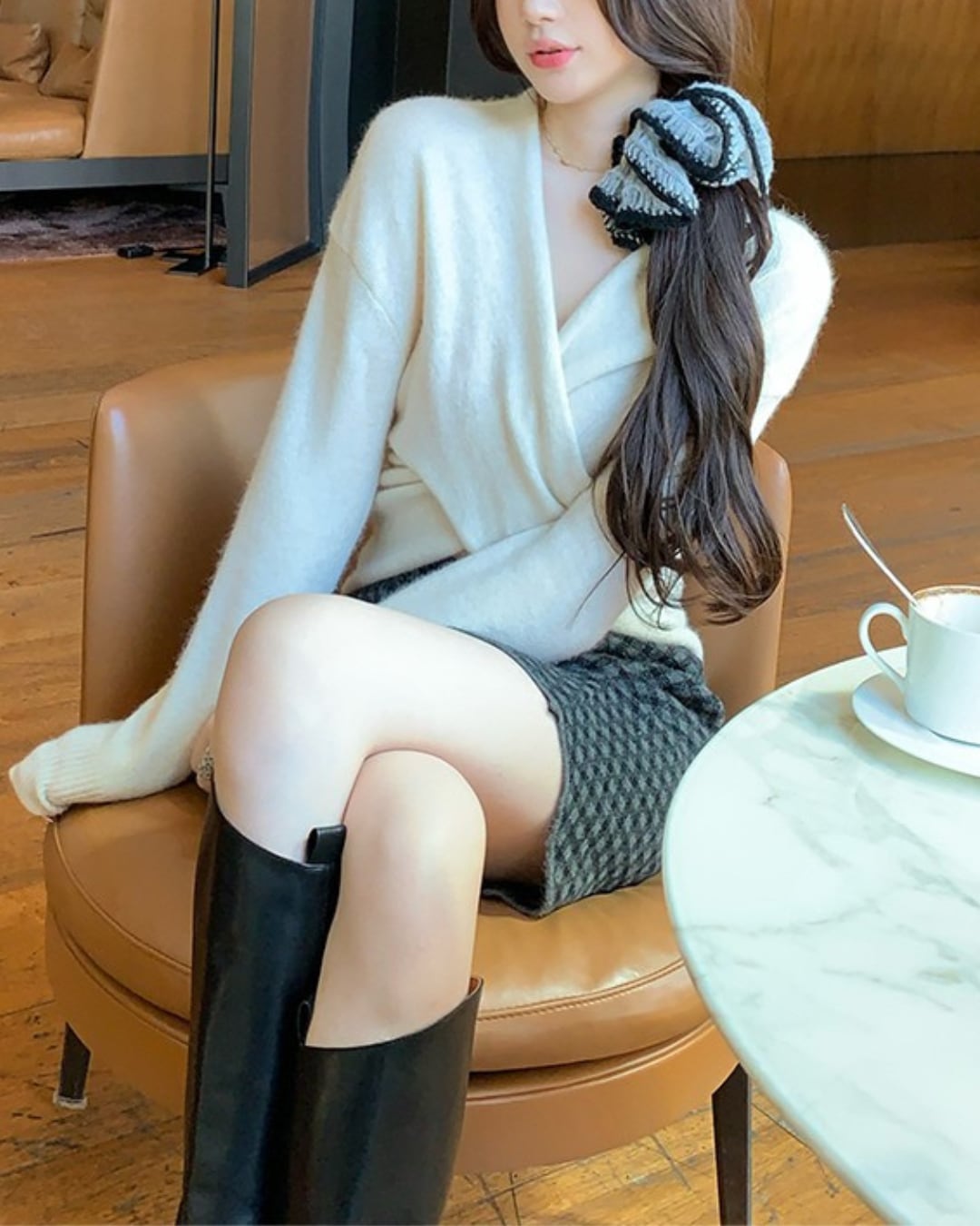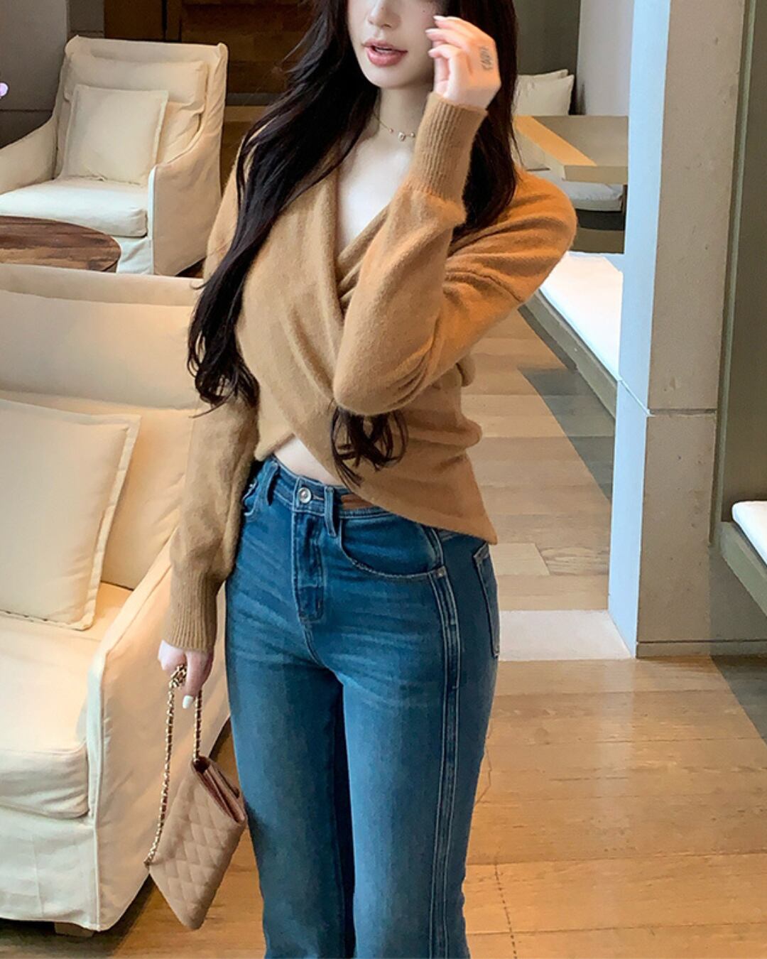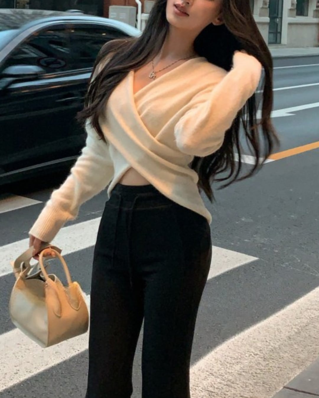 ふわっと柔らかな肌触りが魅力のクロスニットトップス。デコルテを美しく魅せるカシュクールデザインで、女性らしい華奢な印象を演出します。短すぎない丈感で、デニムやスカートなど様々なボトムスと相性抜群。暖かみのある素材感で、秋冬の主役トップスとして活躍します。
