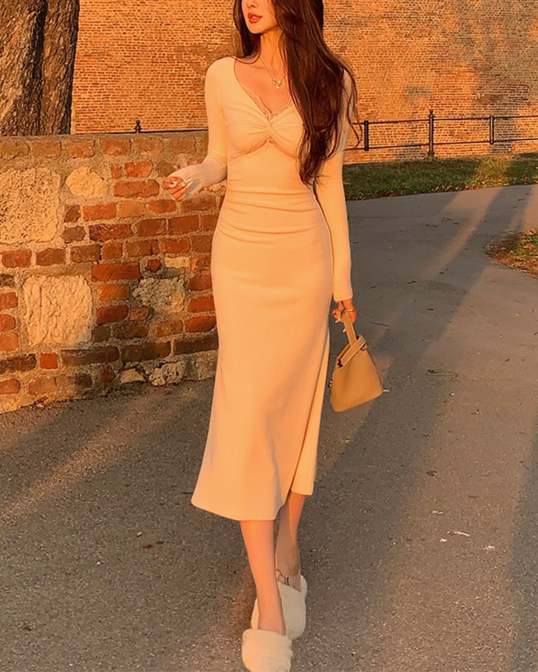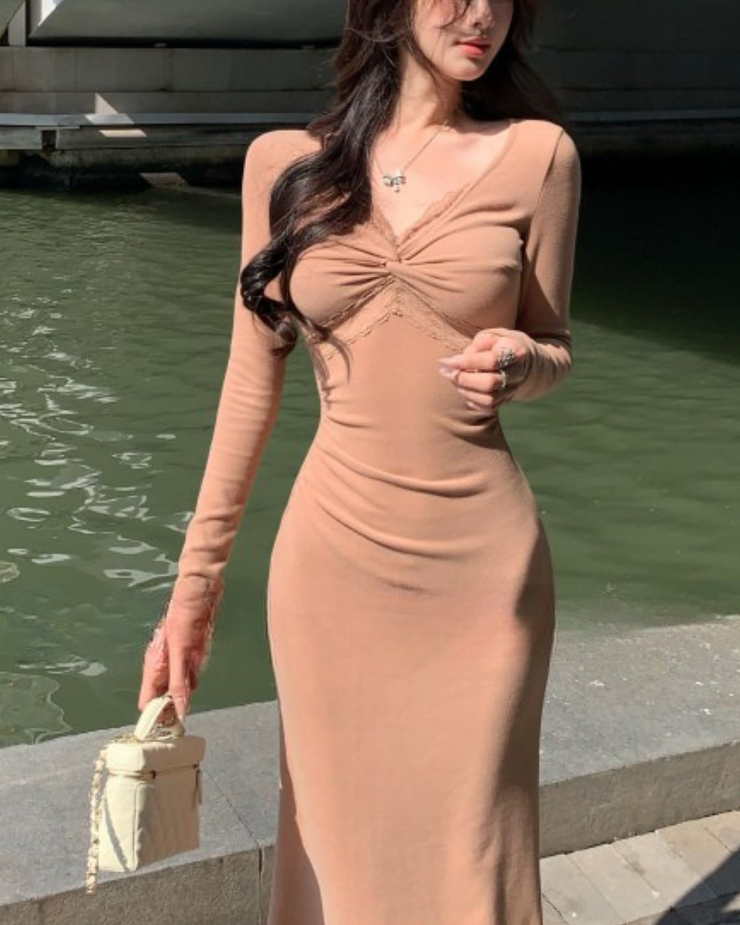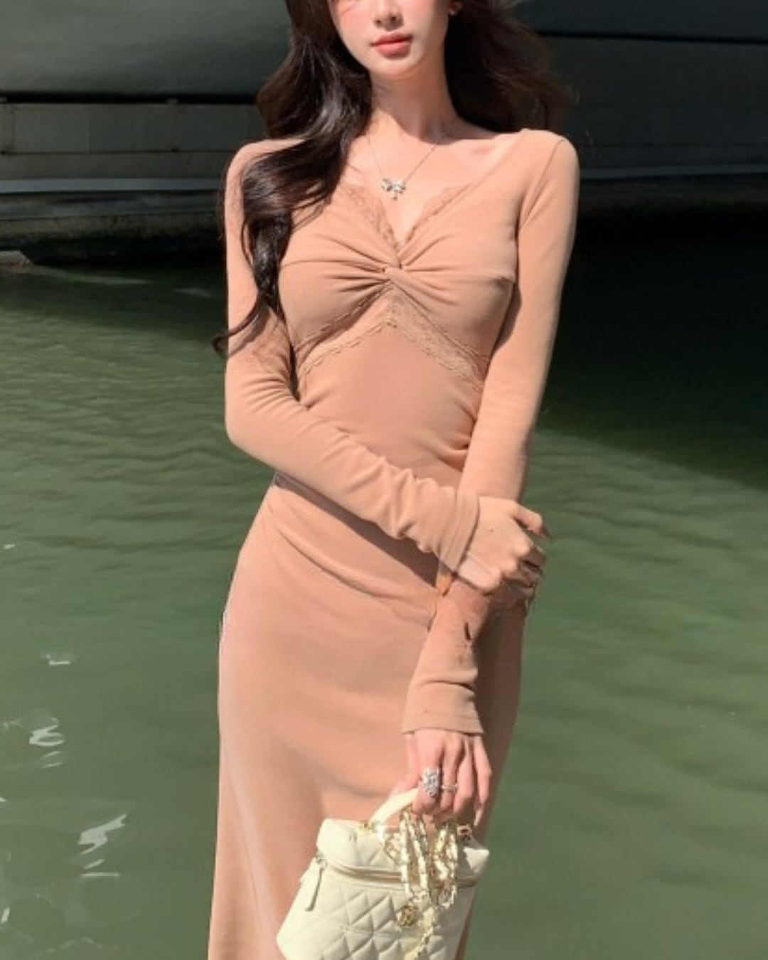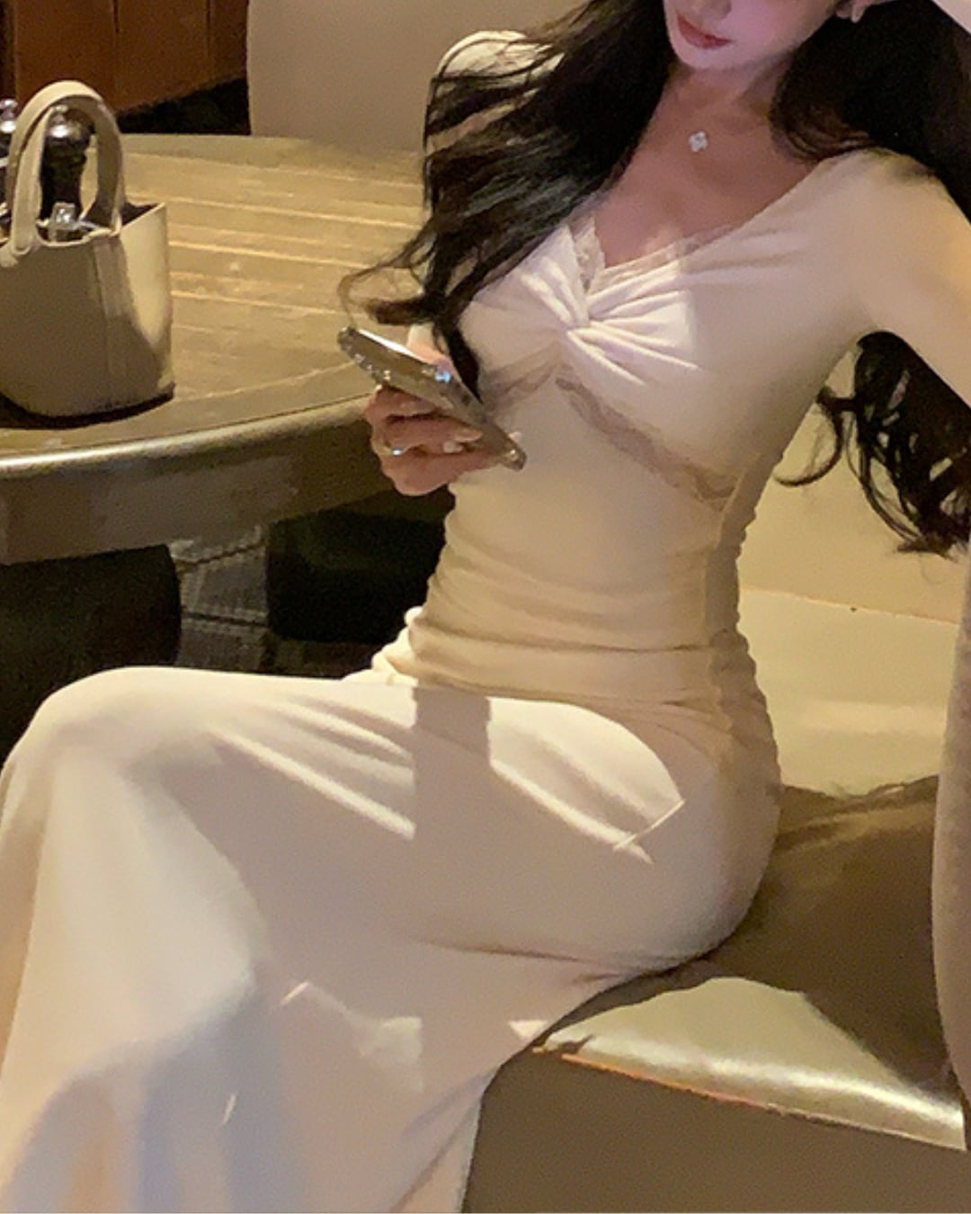 #大人ガーリー #ロングワンピース #レースデザイン #美シルエット #デートコーデ #Vネックワンピ #スリムフィット #上品ワンピ