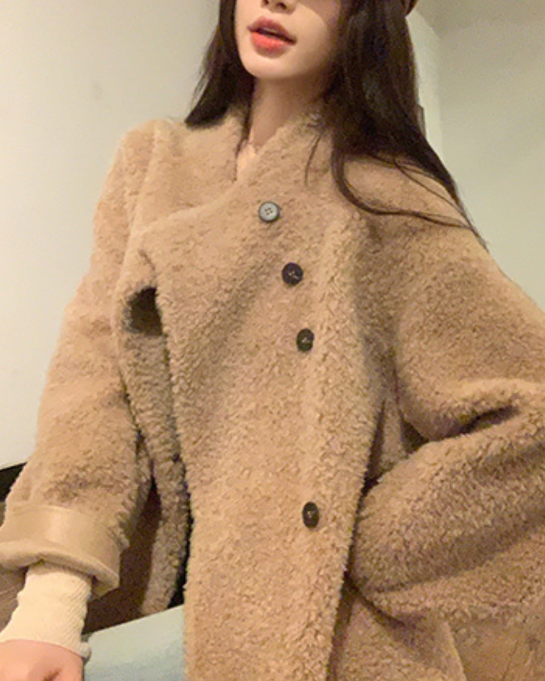 思わず触れたくなるようなふわもこ感が魅力の、100%羊毛素材を使用した高級感あふれるボアコート。柔らかく暖かな着心地で、真冬の寒さもおしゃれに乗り切れるアイテムです。ゆったりとしたオーバーサイズシルエットで、厚手のニットやワンピースの上にも羽織りやすく、コーディネートを一気に格上げしてくれる存在感。ボタンを閉じても開けても様になる、万能アウターです。