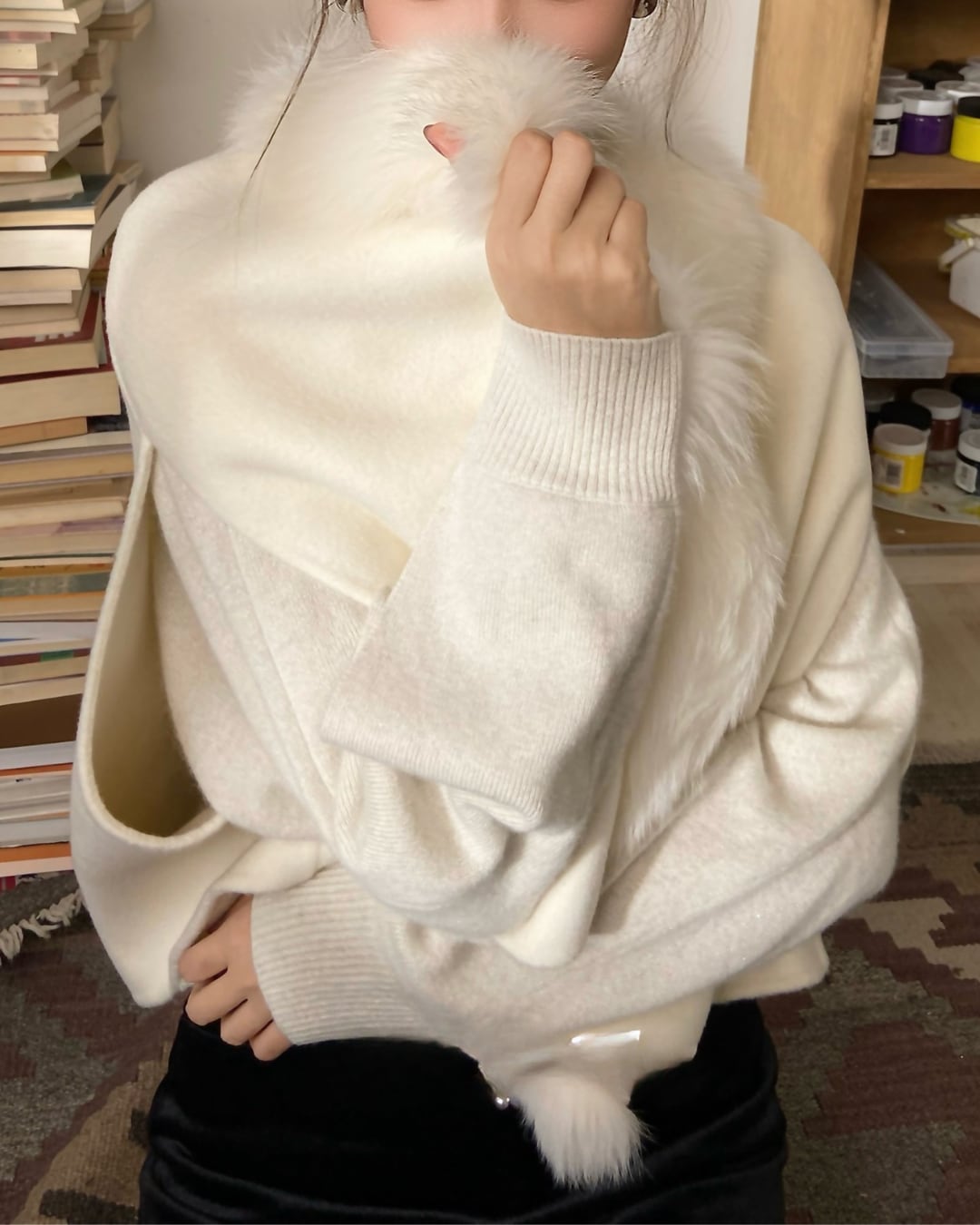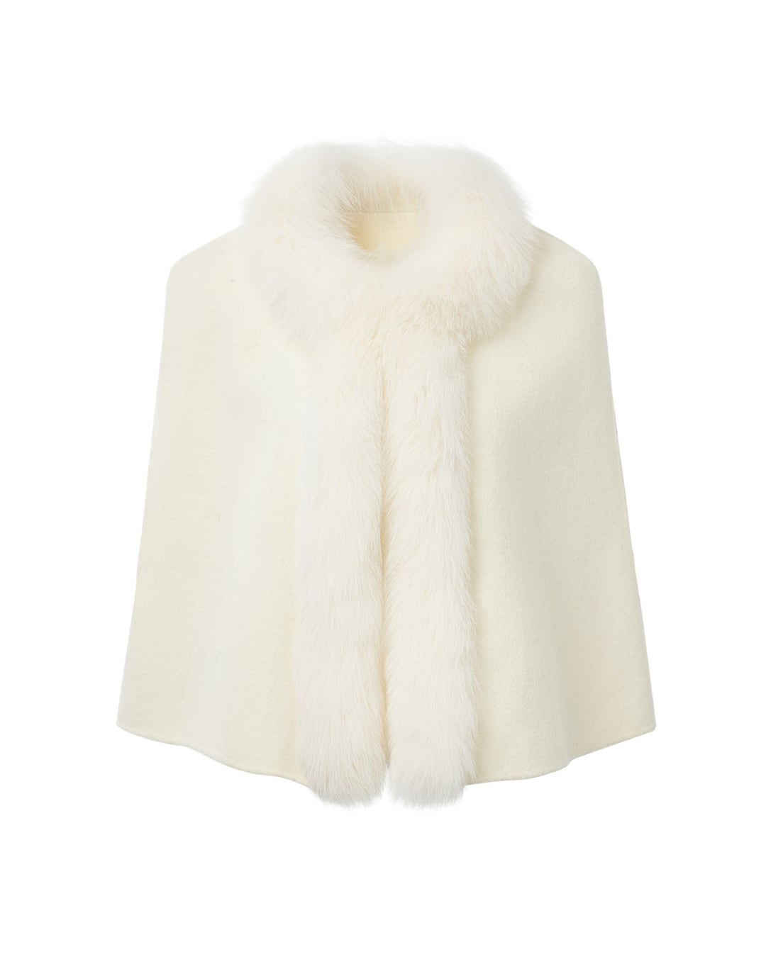 まるで雪の妖精のような、上品な佇まいが魅力のホワイトケープ。ふんわりと贅沢にあしらわれたフォックスファーがリッチ感を演出し、コーデに華やぎをプラスします。ゆったりとしたシルエットで中に厚手のニットを着込んでもすっきり着られ、防寒性も◎。シンプルながらも存在感のある一枚です。