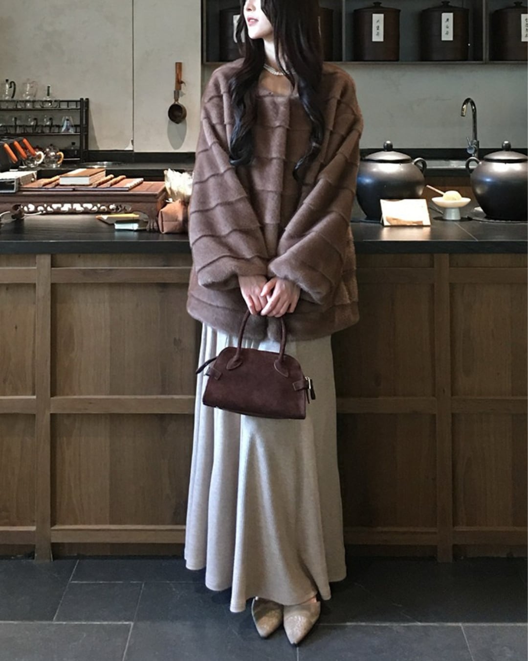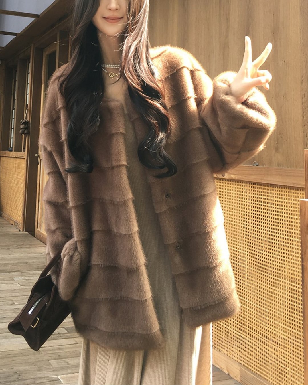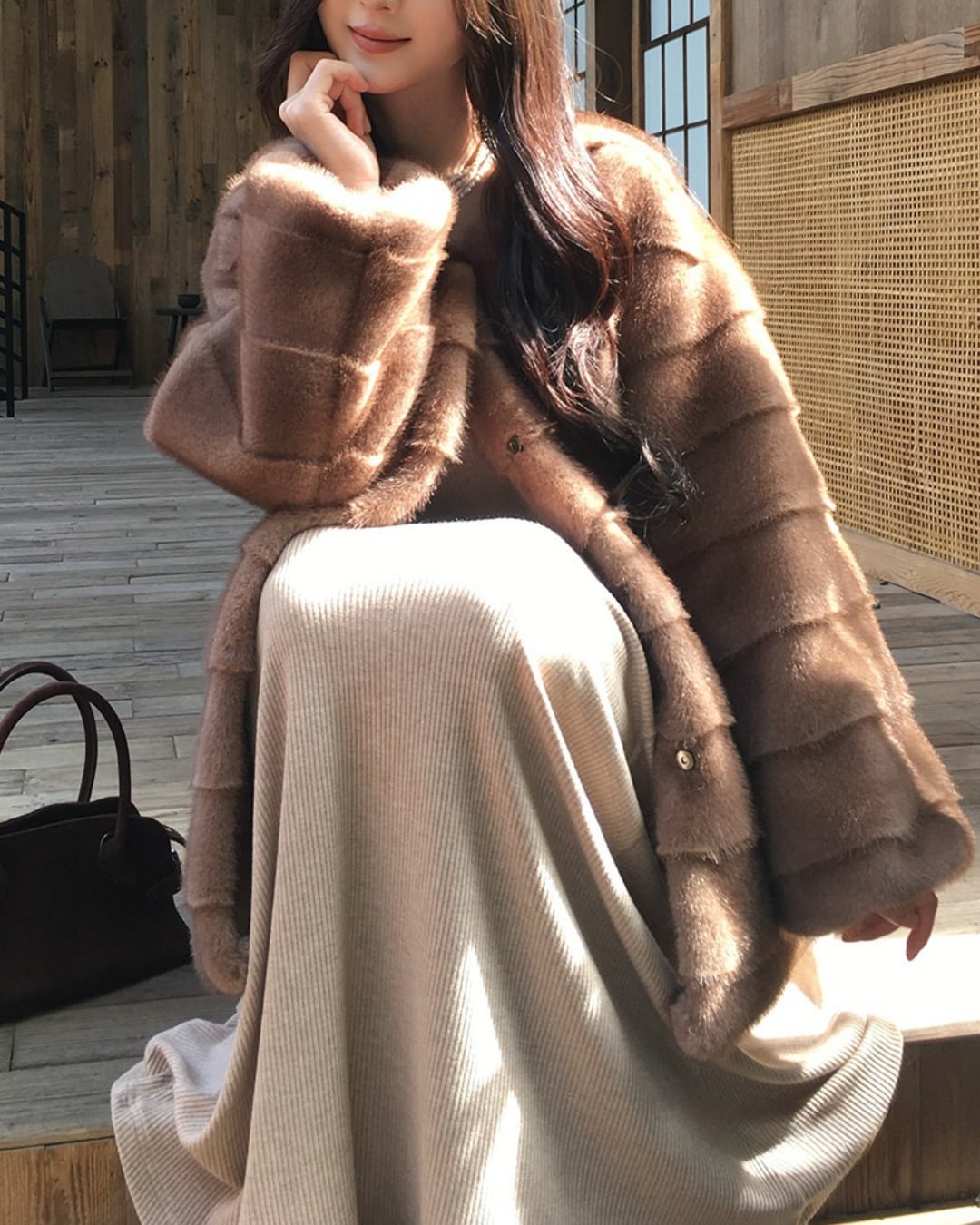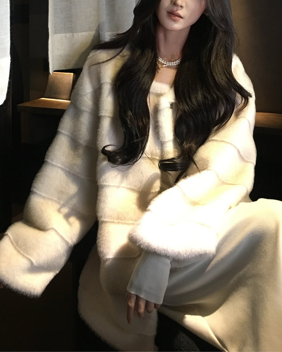 ふわっと軽くて柔らかな肌触りが魅力のエコファーコート。上質なフェイクファーを使用し、ふっくらとした風合いで高級感を演出。シンプルながらも洗練されたボーダー調の切り替えデザインが、着るだけでリッチな雰囲気に。厚手で保温性も高く、これからの季節にぴったり。ワンピースやデニムなど、どんなコーデにも馴染む万能アウターです。両サイドに便利なポケット付き。