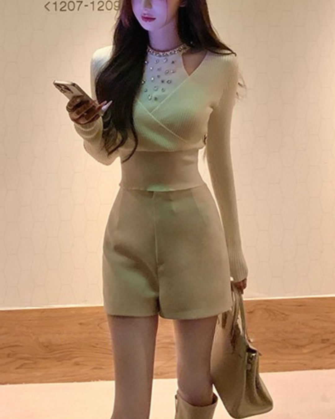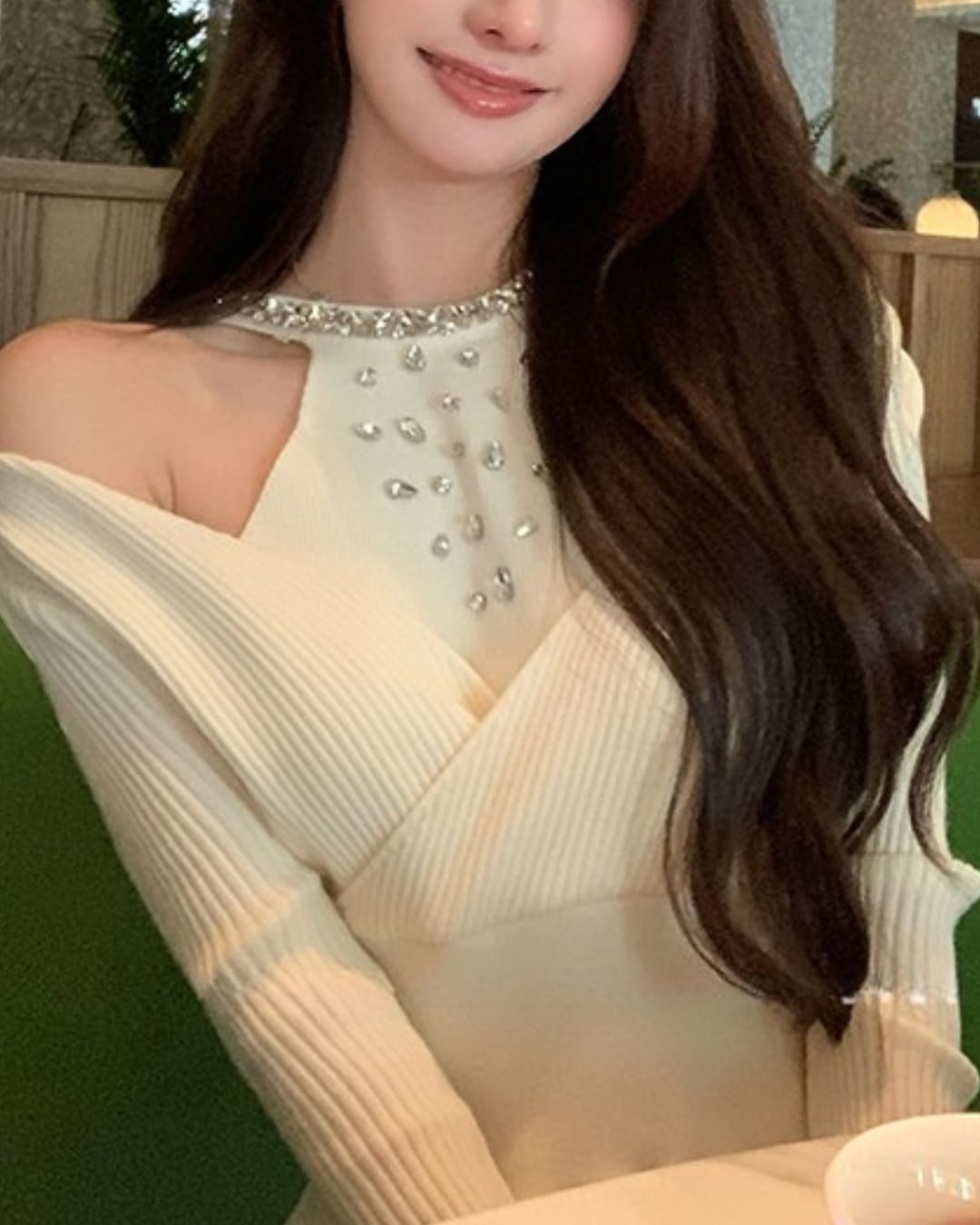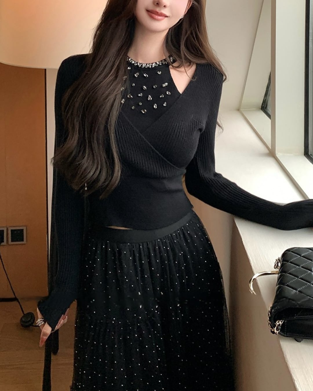 デコルテにカットアウトを施したデザインが特徴的なリブニットトップス。ビジュー装飾が顔まわりを華やかに彩り、上品な印象を与えます。ウエスト部分はややタイトなシルエットでスタイルアップ効果も◎。きれいめスカートやパンツとも相性が良く、デートやお呼ばれシーンにもぴったりな一着です。