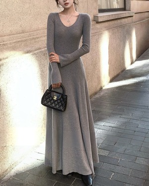 Vネックフィットフレアニットワンピースl5359