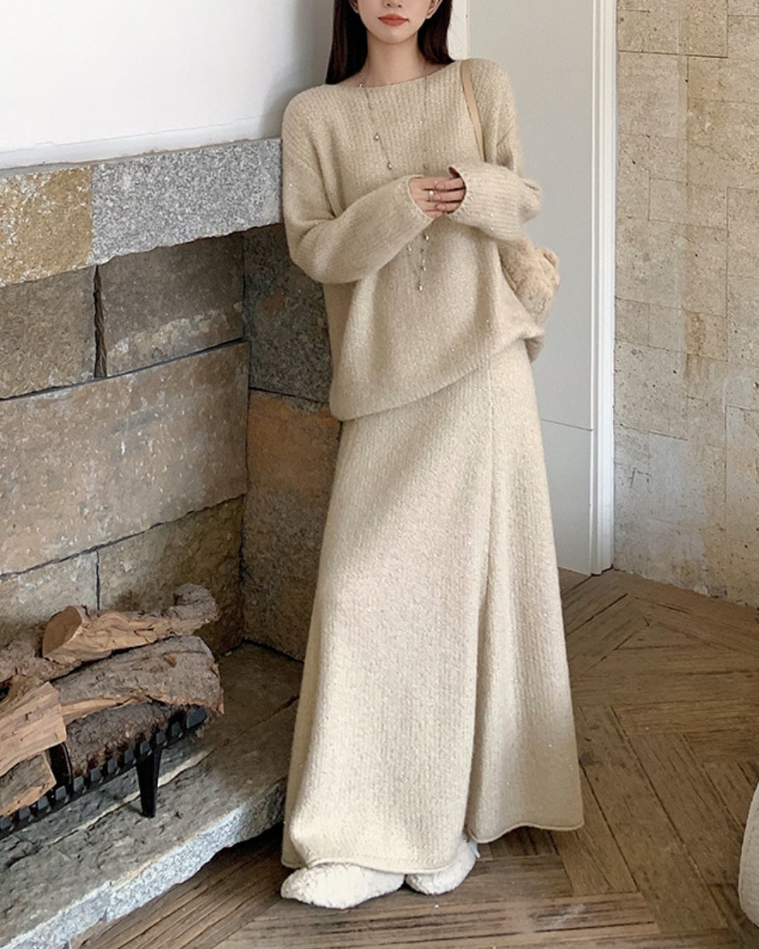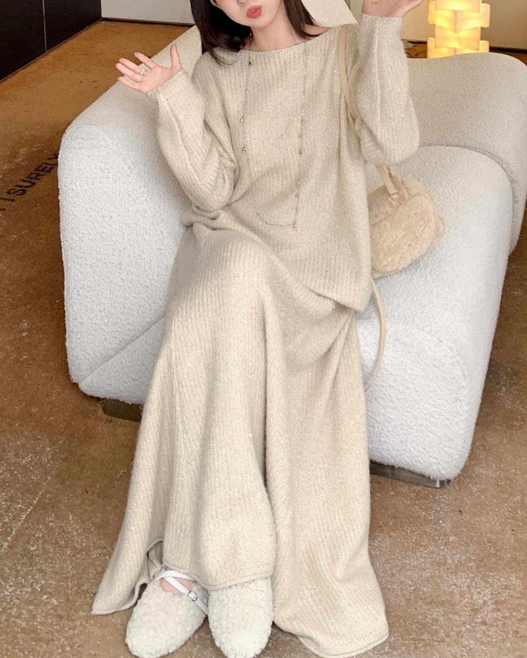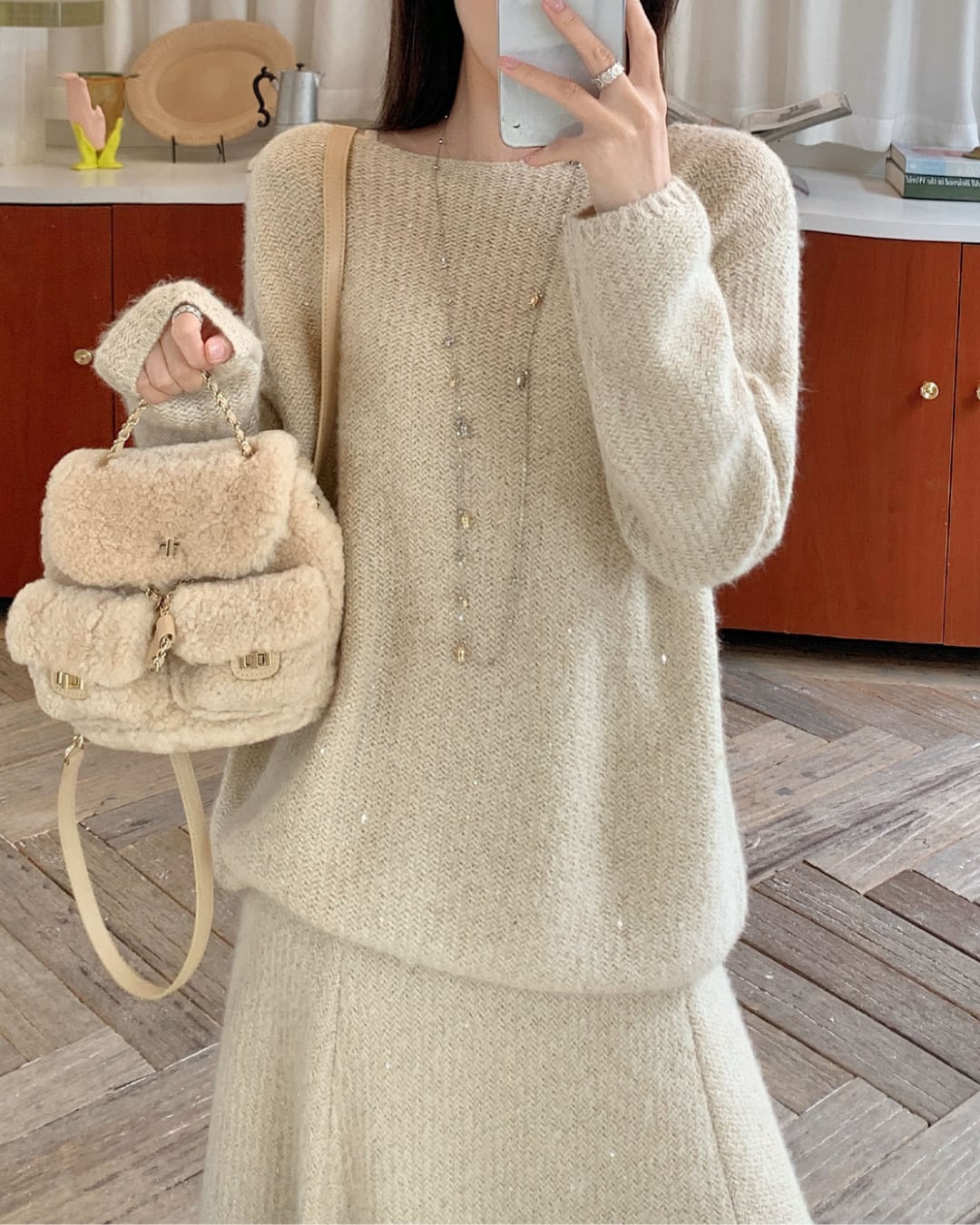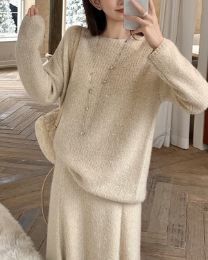 上品な柔らかさとぬくもり感が魅力のニットセットアップ。ややゆったりとしたシルエットで着心地も抜群。トップスは丸みのあるシルエットと程よい厚みで、スカートは広がりすぎないAラインが女性らしさを引き立てます。同色のヘアバンドやバッグと合わせると統一感が生まれ、大人ガーリーなコーデが簡単に完成します。