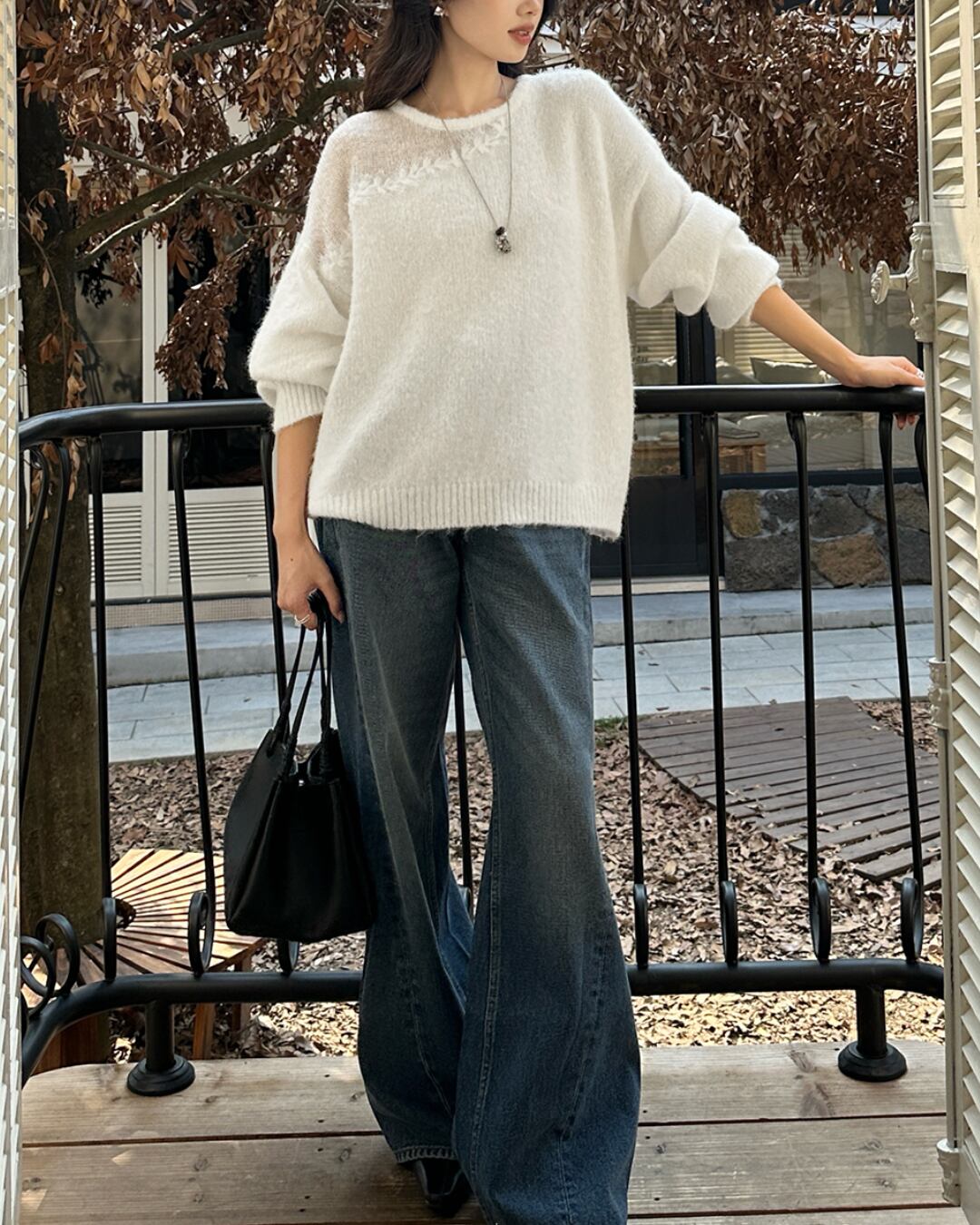 #刺繍ニット #ふわもこ #ホワイトコーデ #大人ガーリー #ゆったりシルエット #秋冬トップス