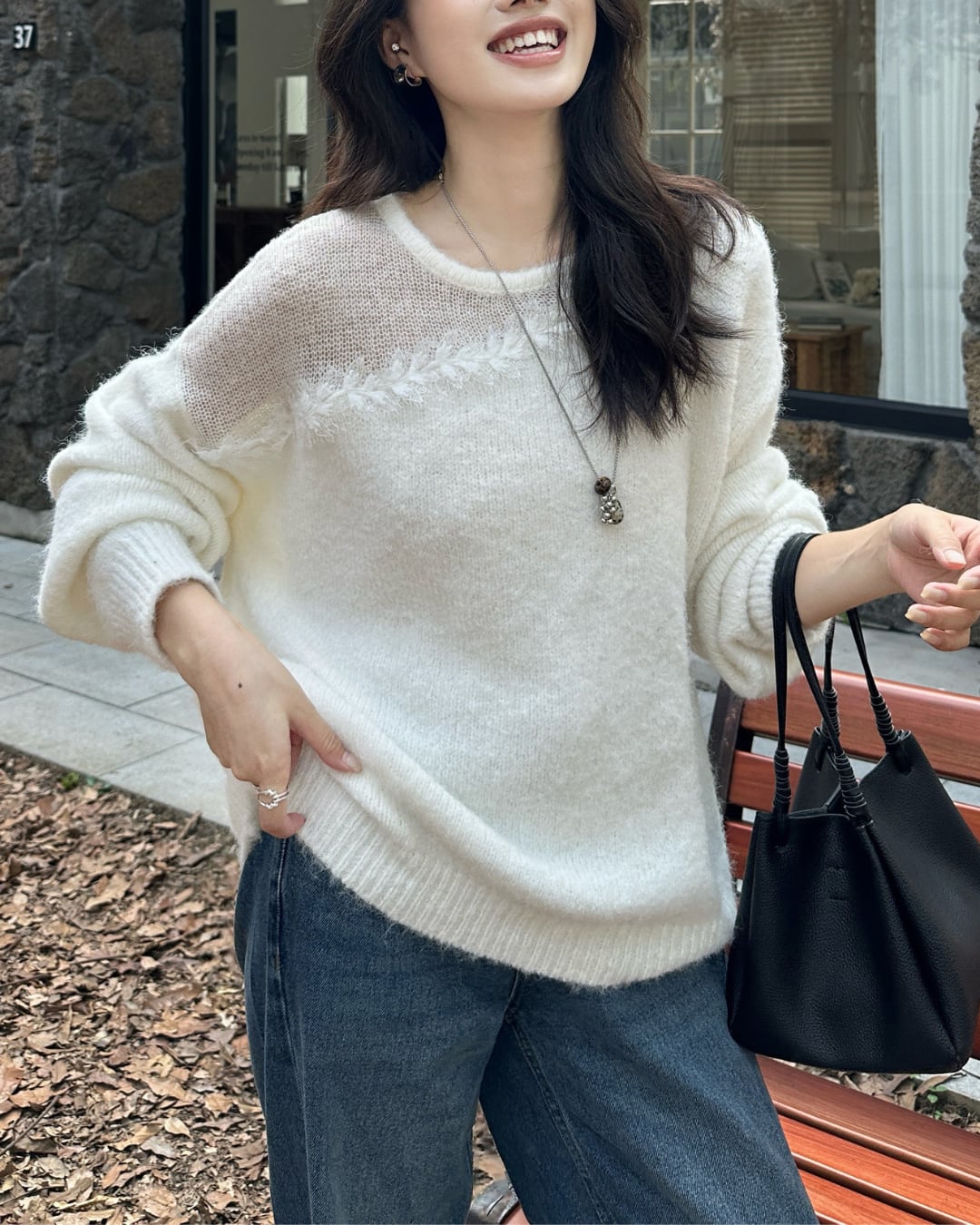 柔らかく肌なじみの良い素材感が魅力のふんわりニット。首元にさりげなくあしらわれた刺繍ディテールがガーリーさをプラス。ゆったりとしたシルエットで体のラインを拾いすぎず、1枚で大人かわいく着こなせる万能アイテムです。パンツにもスカートにも合わせやすく、デイリーに活躍してくれます。