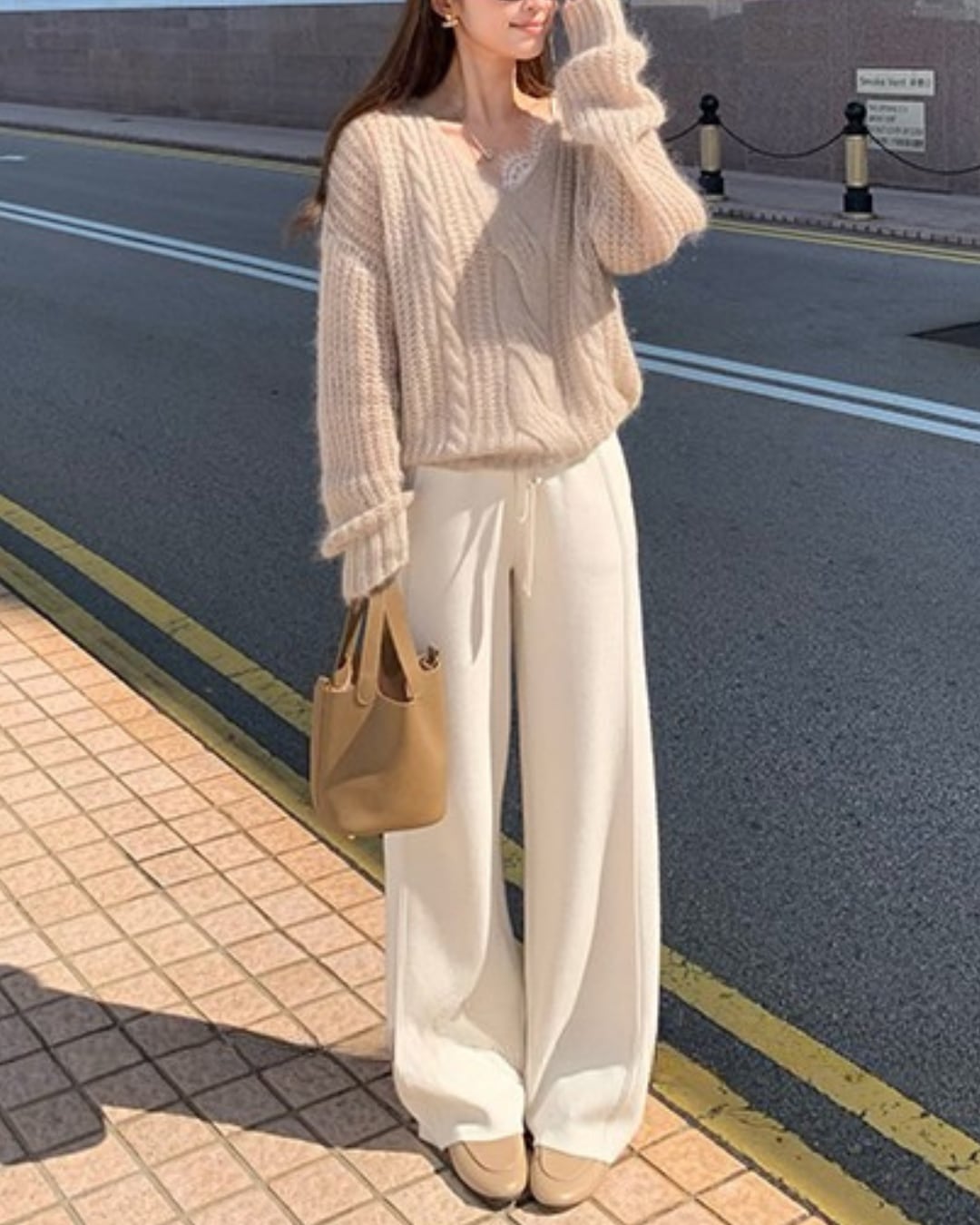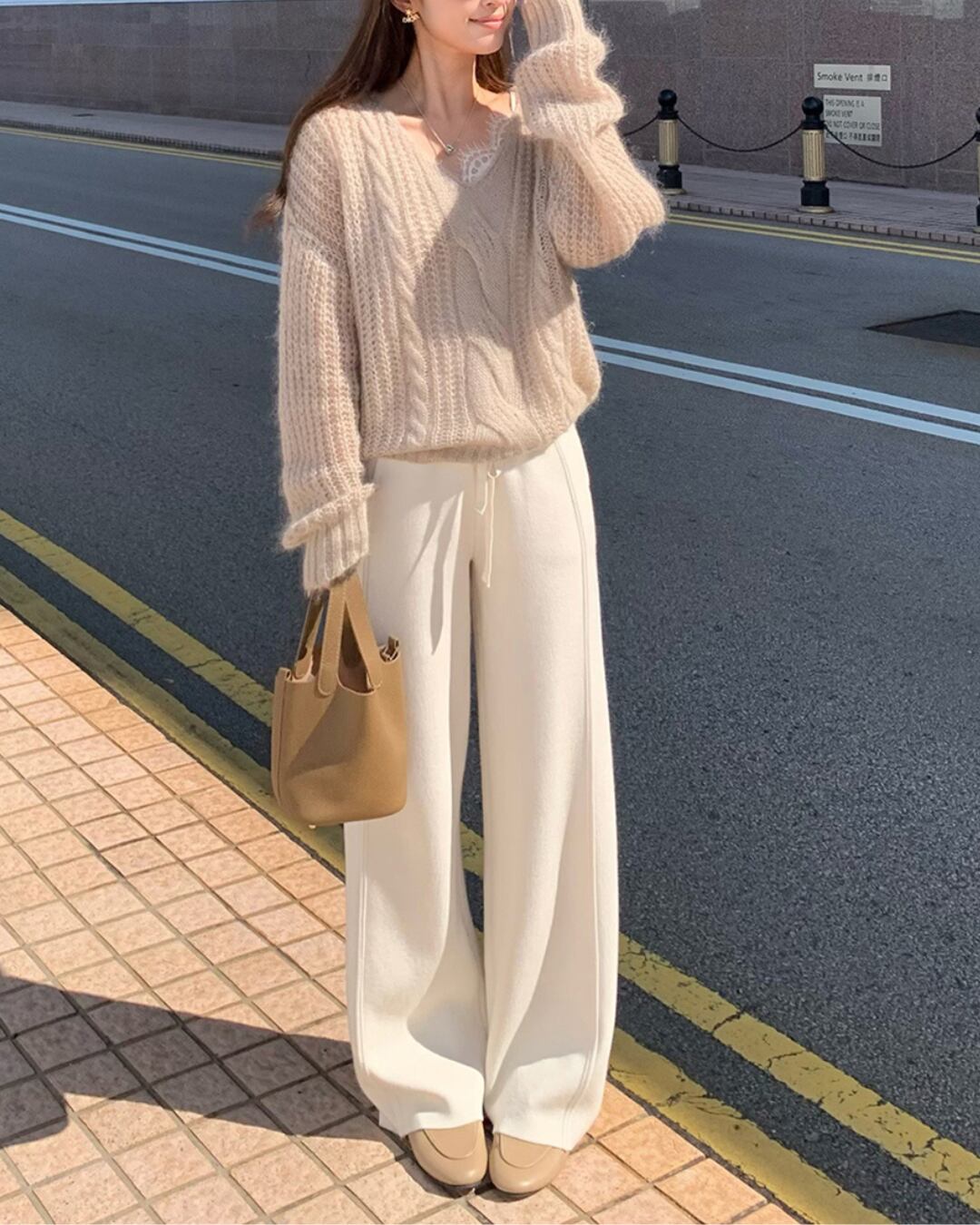 ふわふわと軽やかなシャギーニットに、繊細なレースキャミソールをレイヤードした2点セット。ベージュトーンで優しげな印象に仕上がり、柔らかく肌に馴染む質感が魅力。ニットは立体感のある編み模様とドロップショルダーで抜け感を演出。キャミソールはレース使いが女性らしさを引き立て、インナーとしても1枚でも着回し力◎。シンプルなのに映える、大人のガーリーコーデにぴったりのアイテムです。