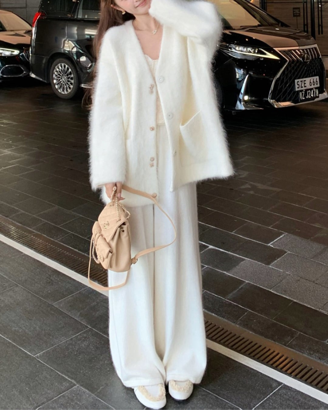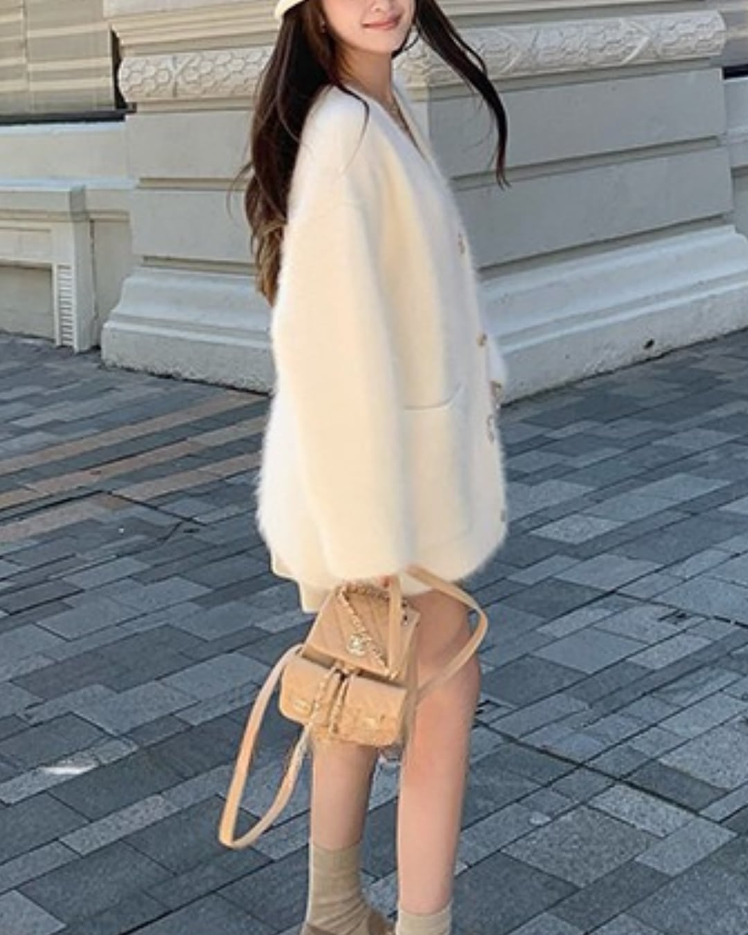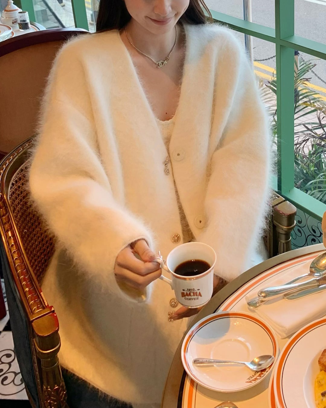 #シャギーニット #ふわふわカーディガン #ホワイトコーデ #大人ガーリー #高見えアウター #ゆったりシルエット
