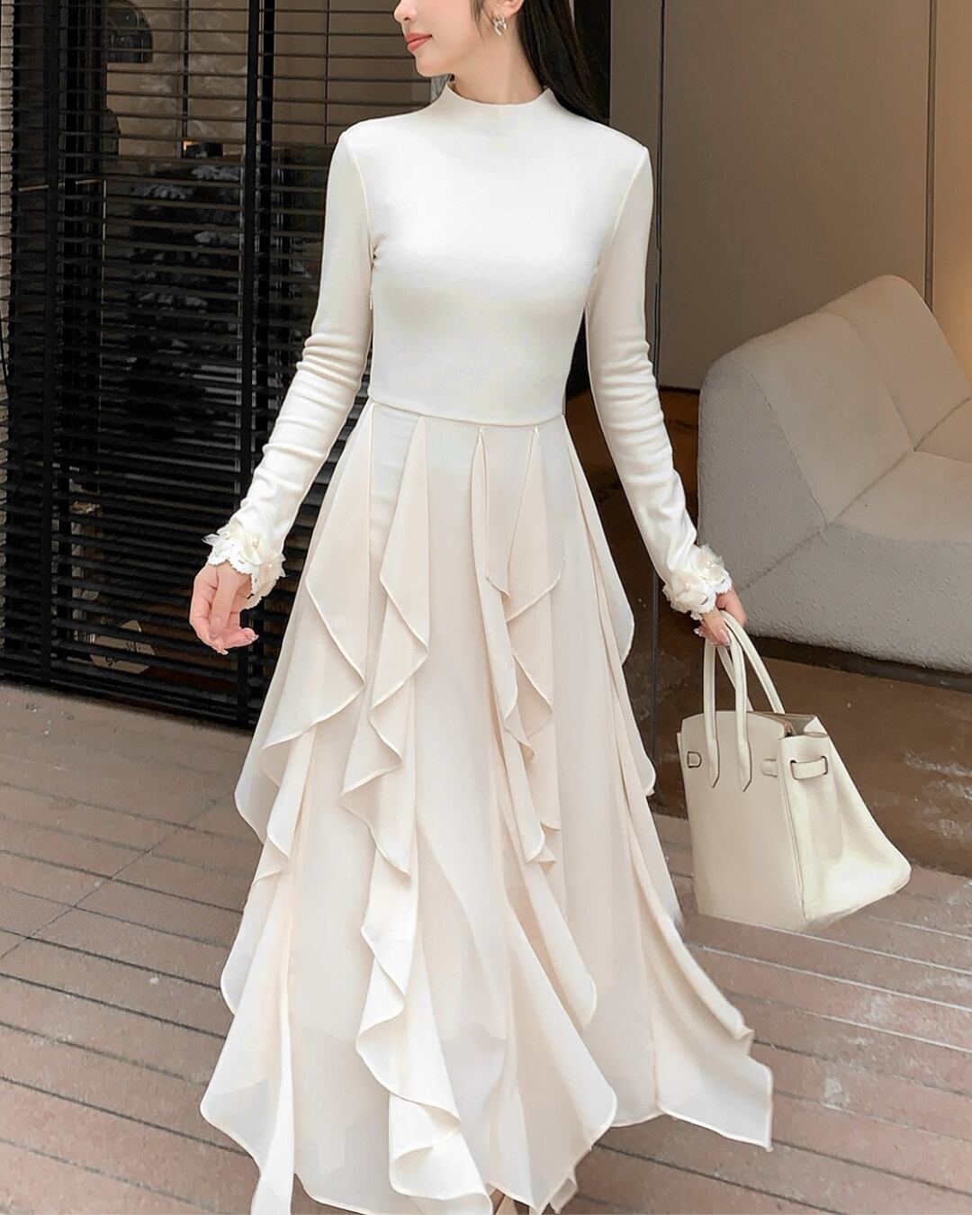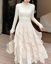 #段フリルスカート #ハイネック #花モチーフ #フィット&フレア #ドッキングワンピース #大人フェミニン #パーティーコーデ