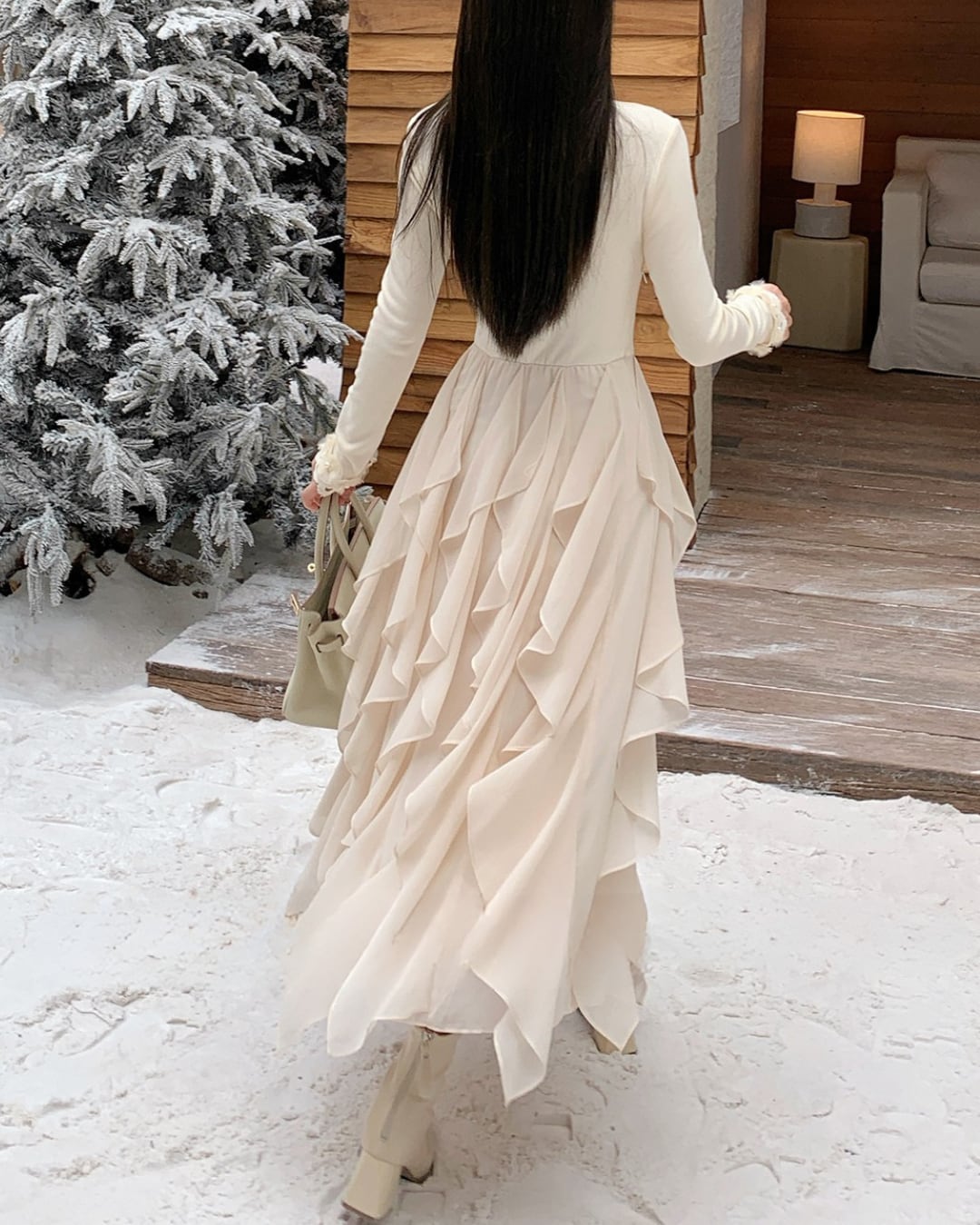 女性らしさを引き立てる、柔らかく伸びのあるトップスと、波打つような段フリルが印象的なフレアスカートがドッキングされたドレスワンピース。袖口には立体的なフラワーパーツがあしらわれており、手元まで華やかに演出。伸縮性のあるトップ部分は程よいフィット感で着心地も快適。お呼ばれや特別なデートにもぴったりな、エレガントさと可憐さを兼ね備えた1着です。