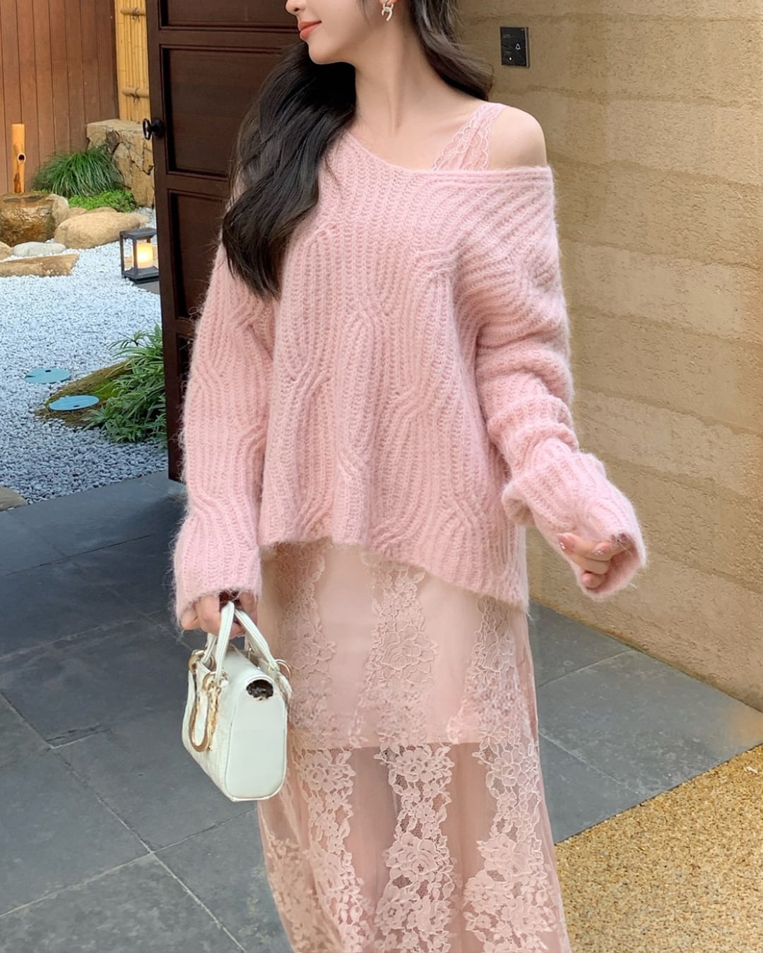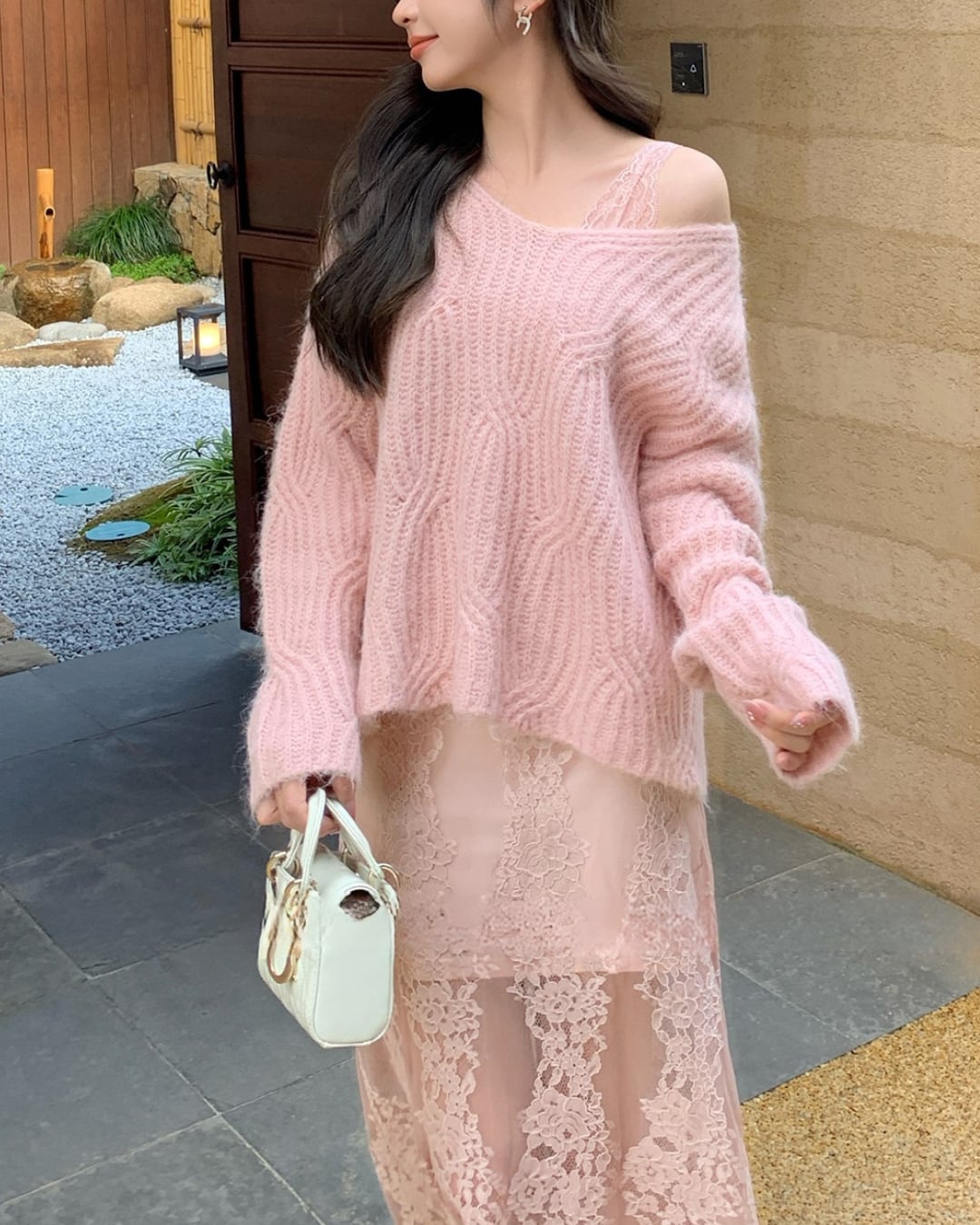 #オフショルニット #ゆるニット #モヘア風 #大人ガーリー #透け感トップス #レースインナー合わせ #肌見せニット