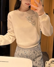 立体的なフラワービジューとパールを散りばめた、華やかさと上品さを兼ね備えたスウェットトップス。シンプルなシルエットにきらめくディテールが映え、カジュアルなのに洗練された印象に仕上がります。程よくゆとりのあるサイズ感で、スカートにもパンツにも合わせやすく、デイリーからお出かけまで幅広く活躍。しっかりとした素材感で1枚でも暖かく、秋冬シーズンにぴったりなアイテムです。