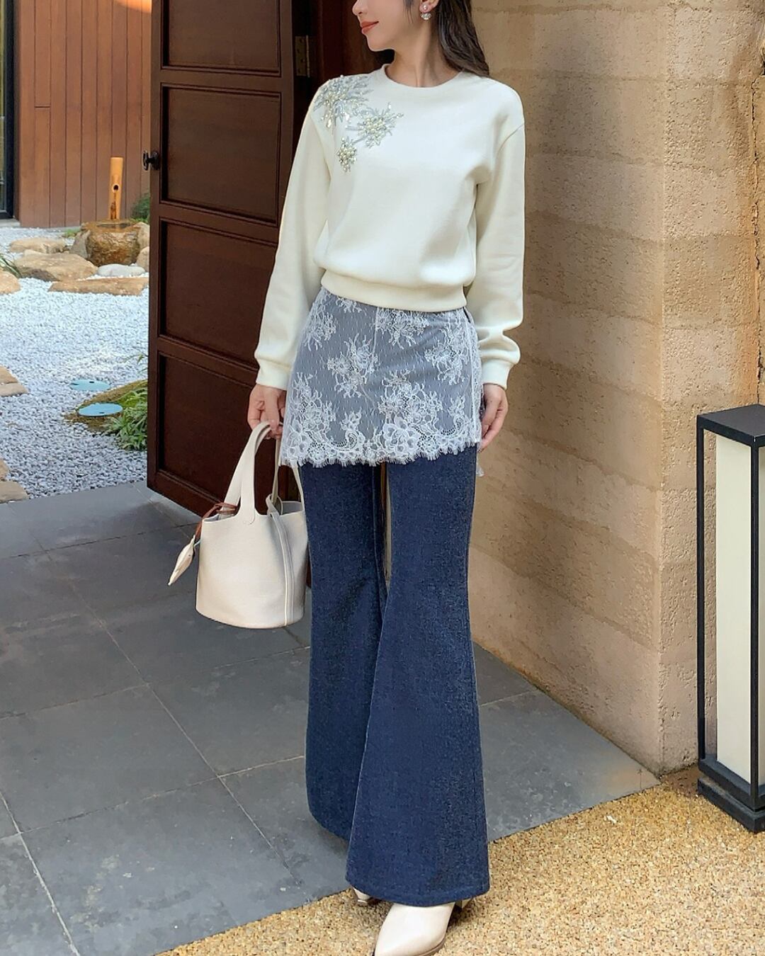 #ビジュー付きトップス #スウェット #大人可愛い #パール刺繍 #秋冬コーデ #カジュアルガーリー #ゆるコーデ