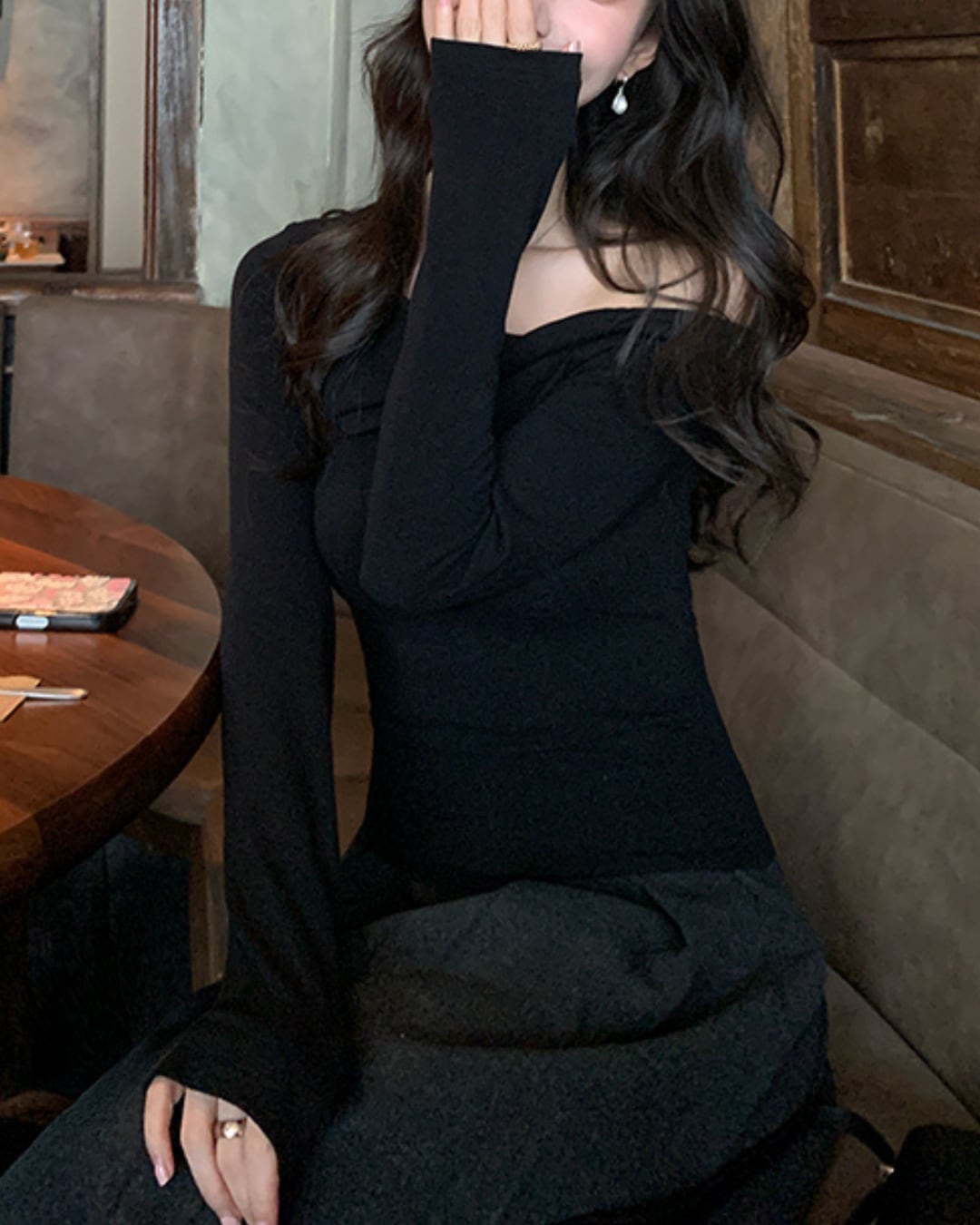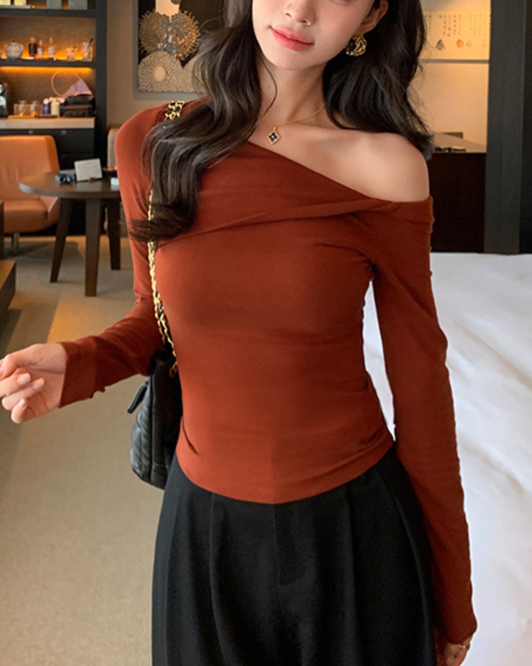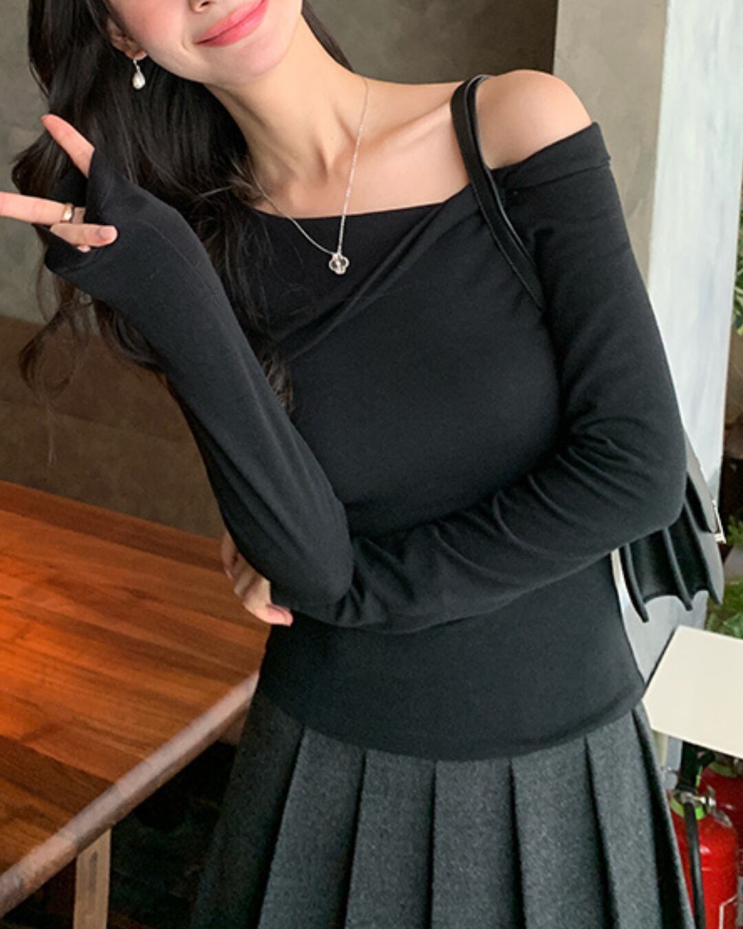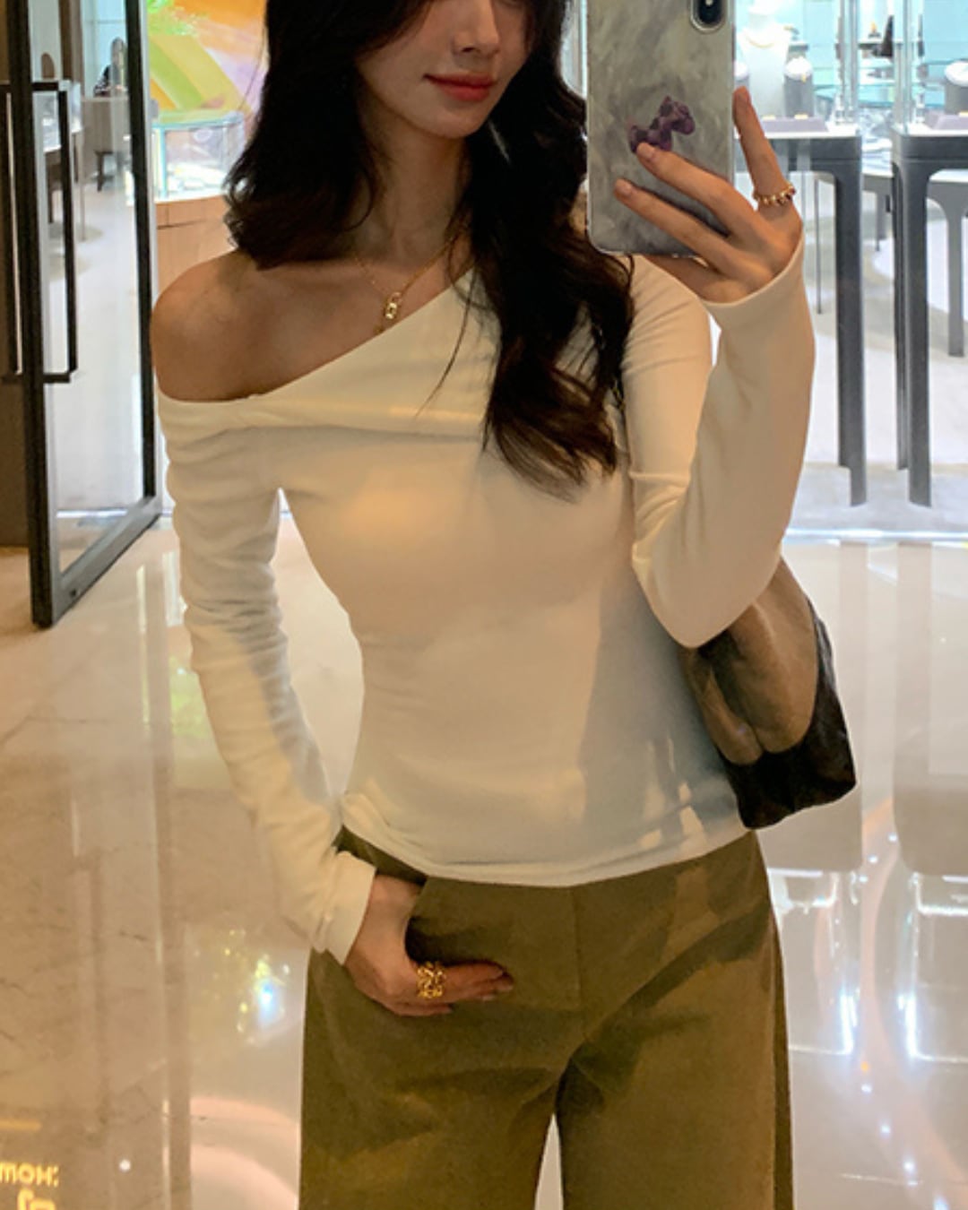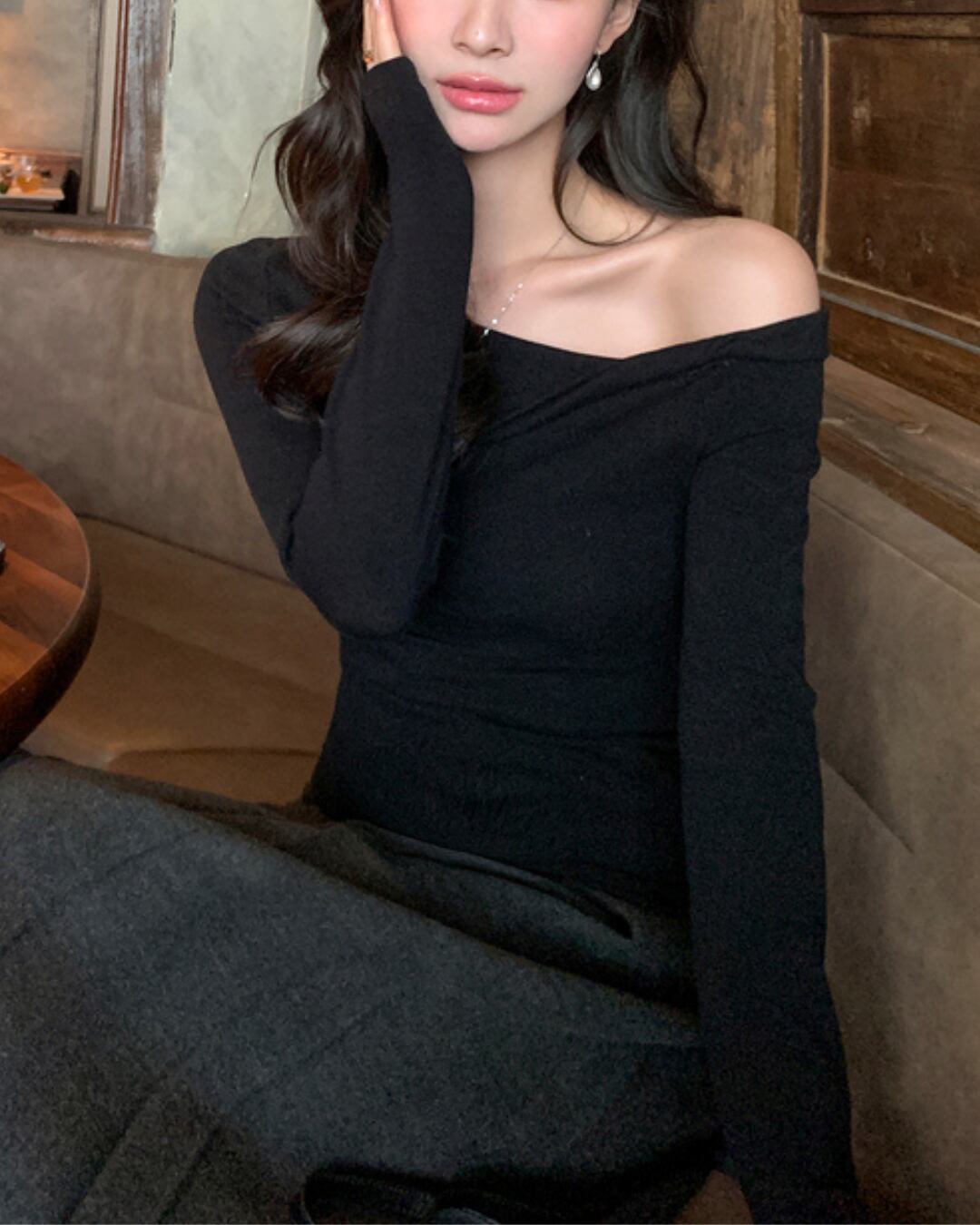 大人の色気を引き出すアシンメトリーデザインのオフショルダートップス。ボディに程よくフィットするシルエットで、女性らしいラインを美しく演出。デコルテをきれいに見せてくれる絶妙なカッティングがポイントです。デニムやスカート合わせで、カジュアルにもフェミニンにも着回し自在のアイテムです。