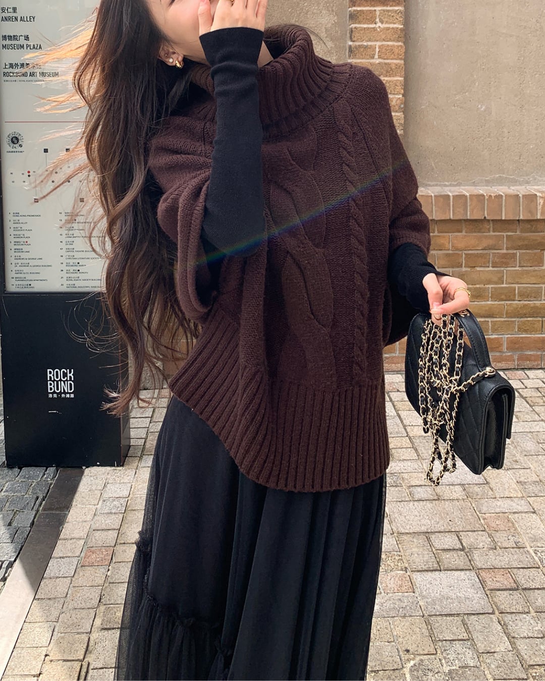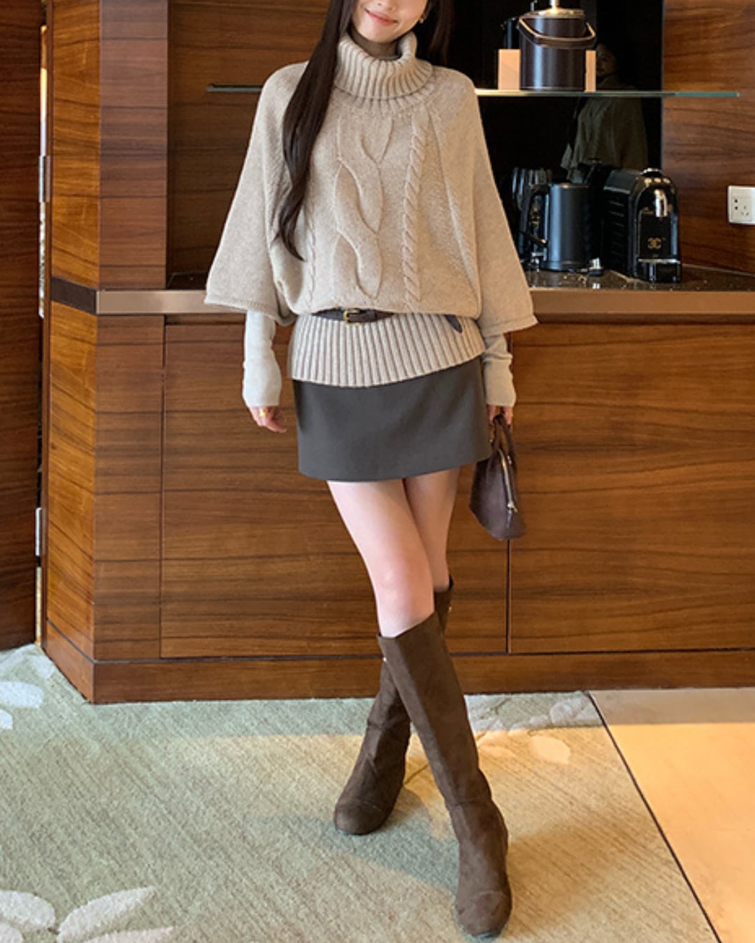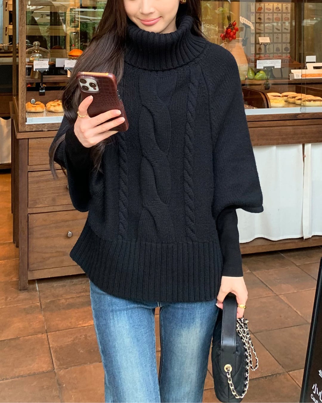 #ハイネック #ゆるニット #ケーブル編み #五分袖ニット #大人ガーリー #ウール混 #重ね着コーデ #秋冬トップス