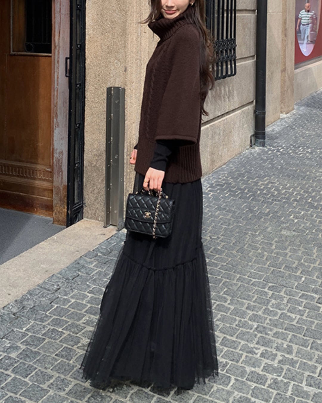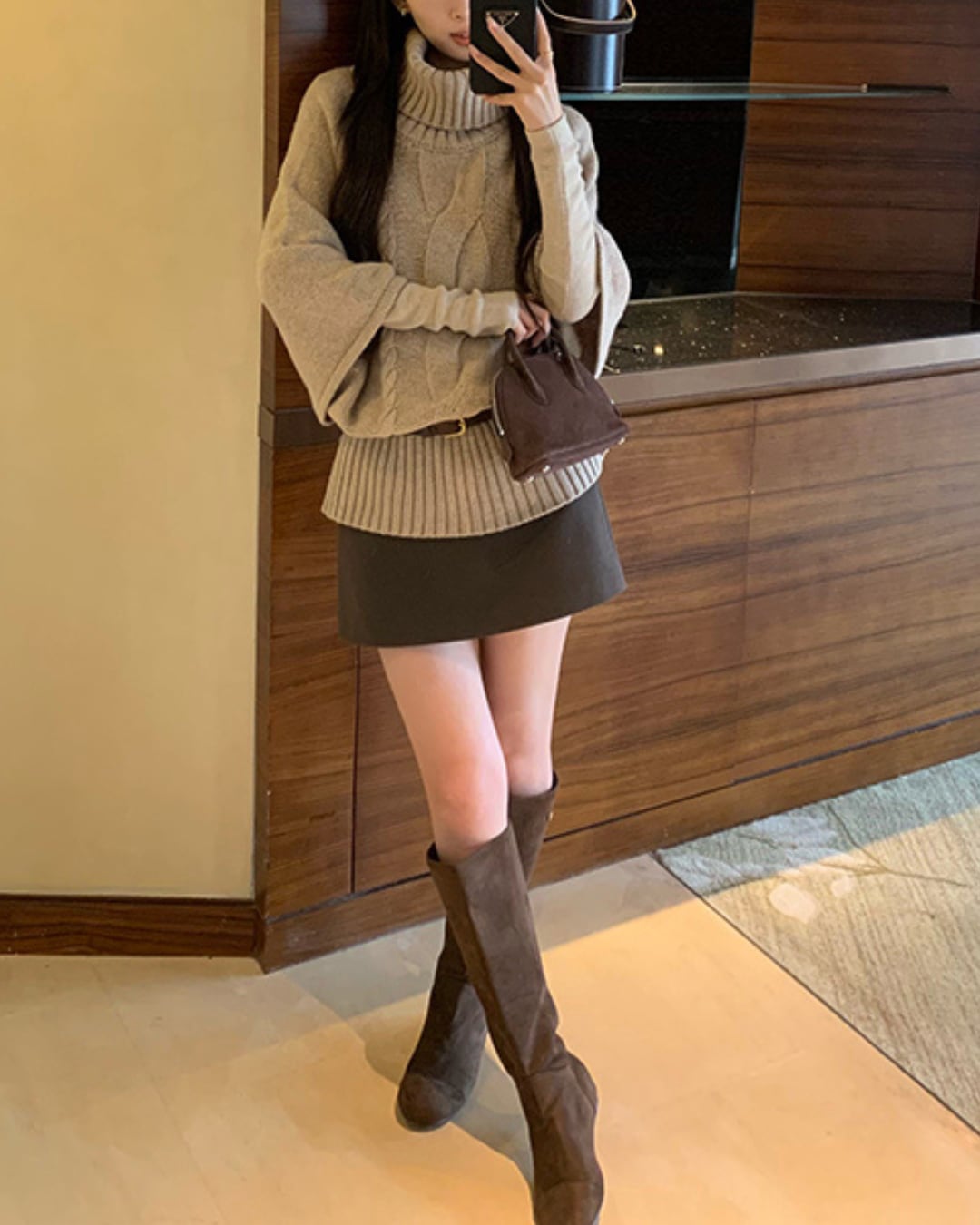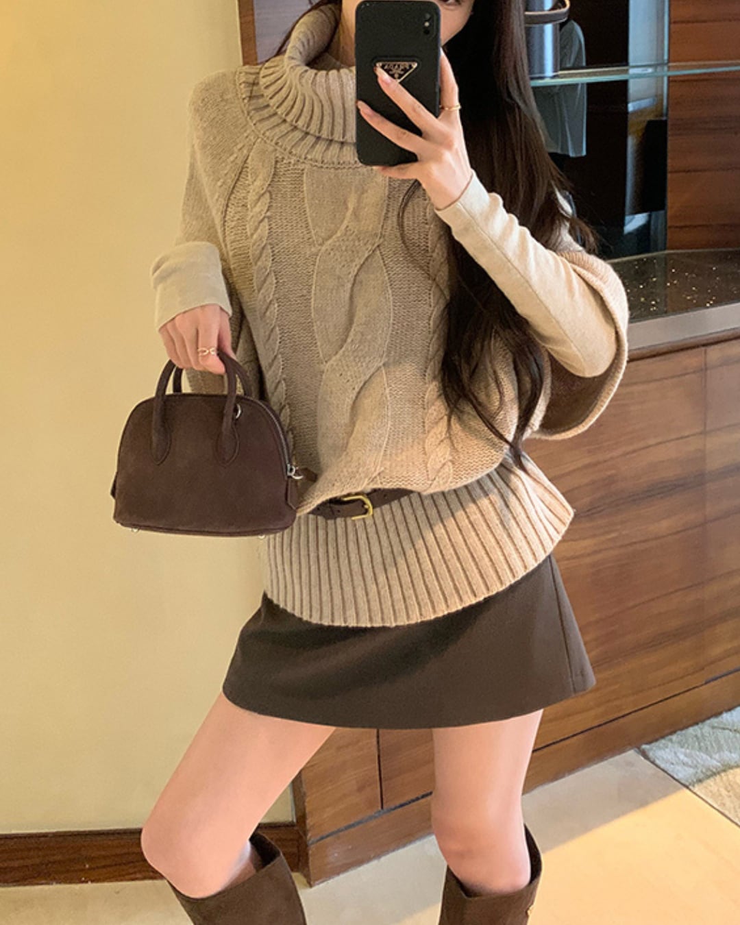 #ハイネック #ゆるニット #ケーブル編み #五分袖ニット #大人ガーリー #ウール混 #重ね着コーデ #秋冬トップス