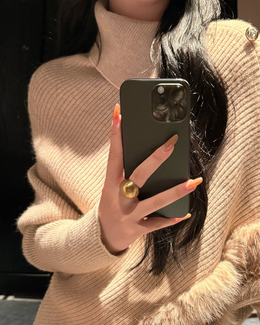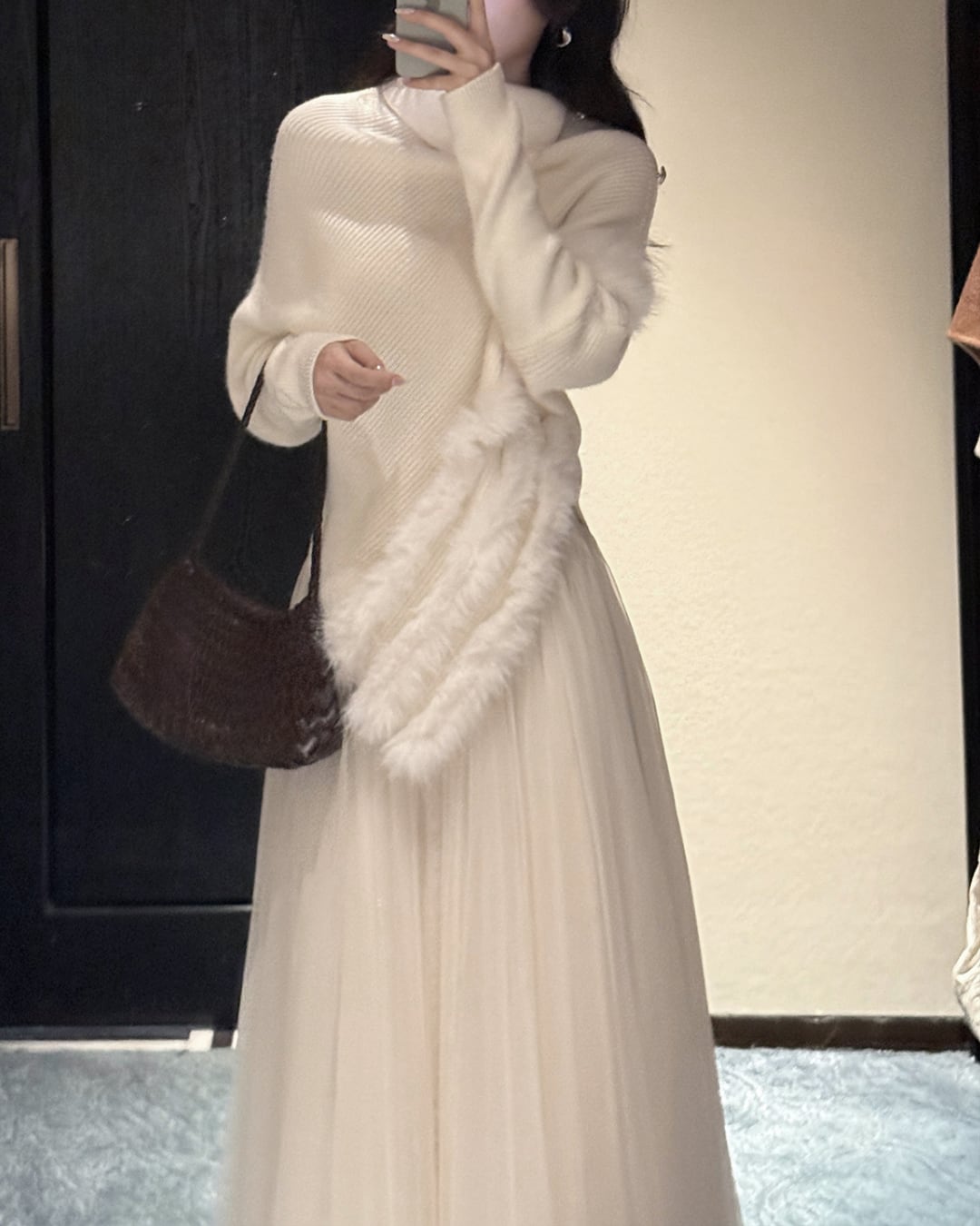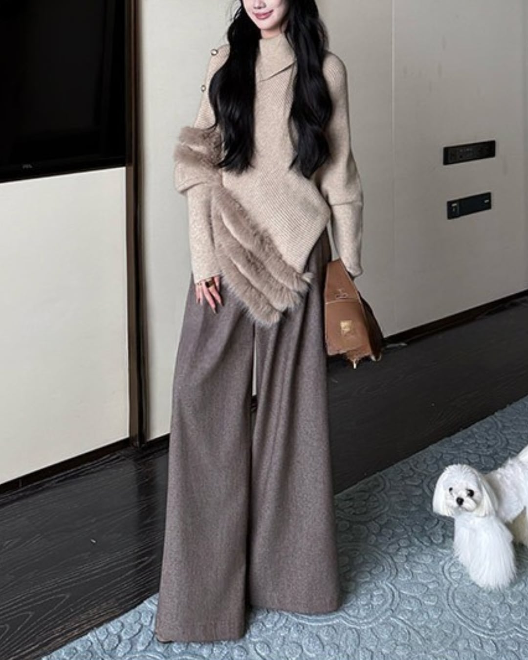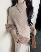 #フェイクファー #金ボタンデザイン #アシンメトリーニット #大人ガーリー #フェミニンコーデ #アイボリー #カーキ #秋冬トップス #ゆるシルエット