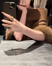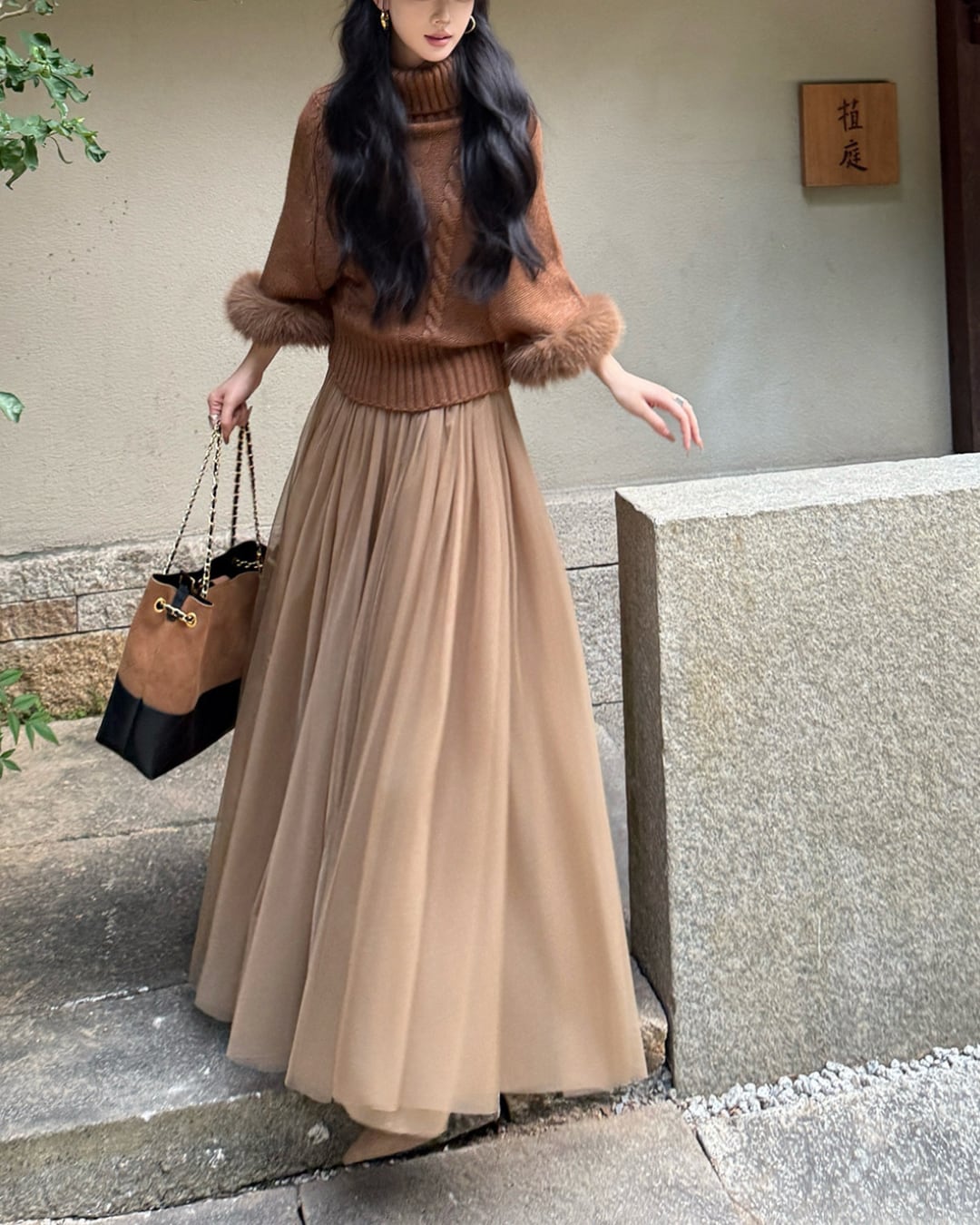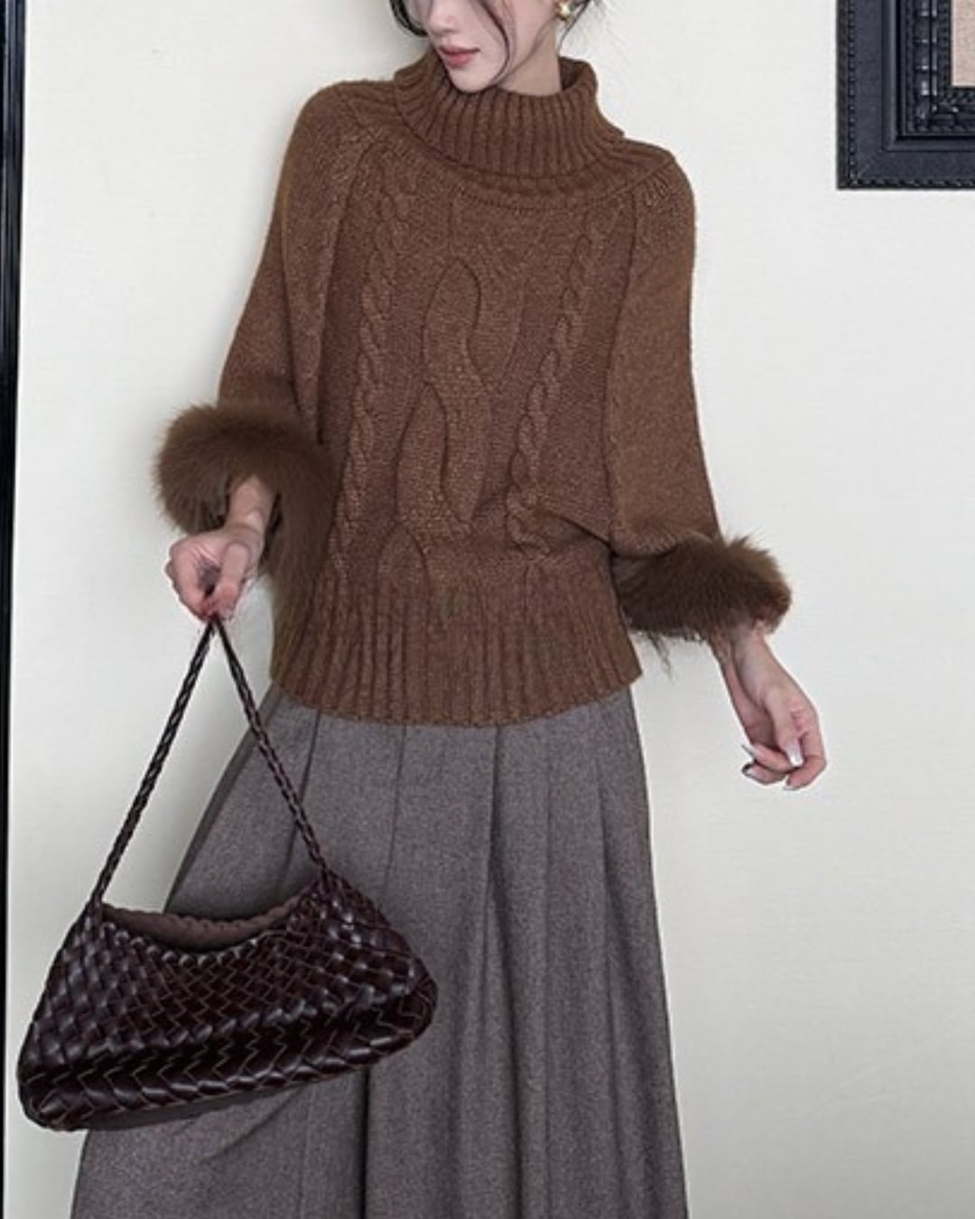 #リブニット #ファー袖 #タートルネック #フェミニンコーデ #ブラウンニット #冬トップス