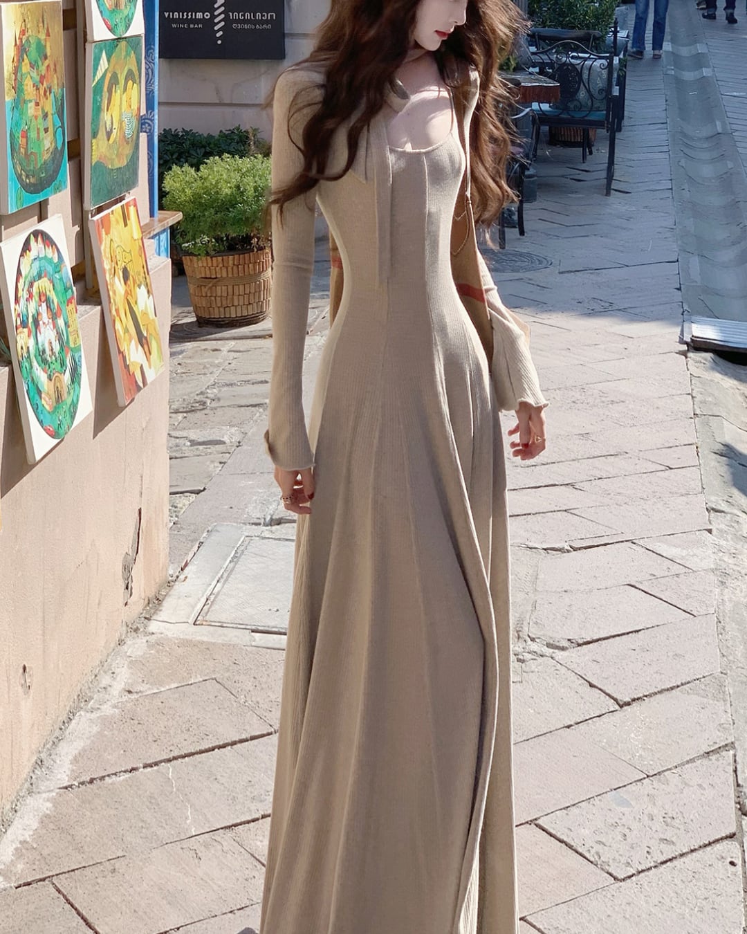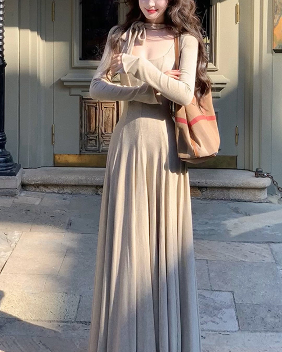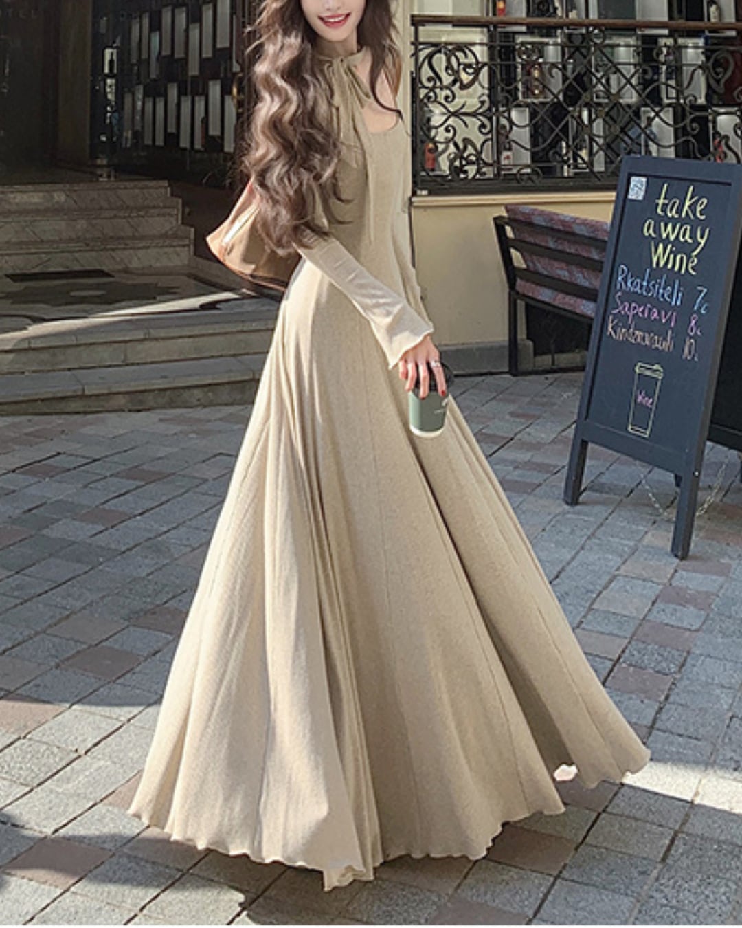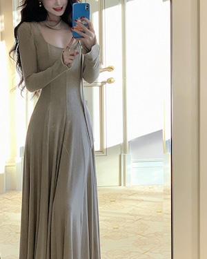 #スクエアネック #リボンアレンジ #ロングワンピース #美シルエット #大人ガーリー #体型カバー #秋冬ワンピース